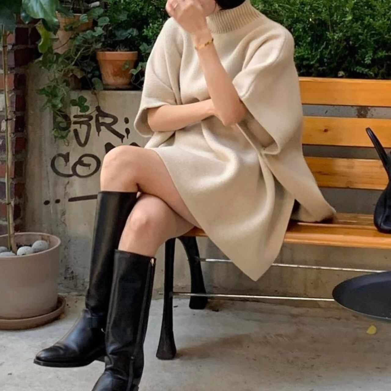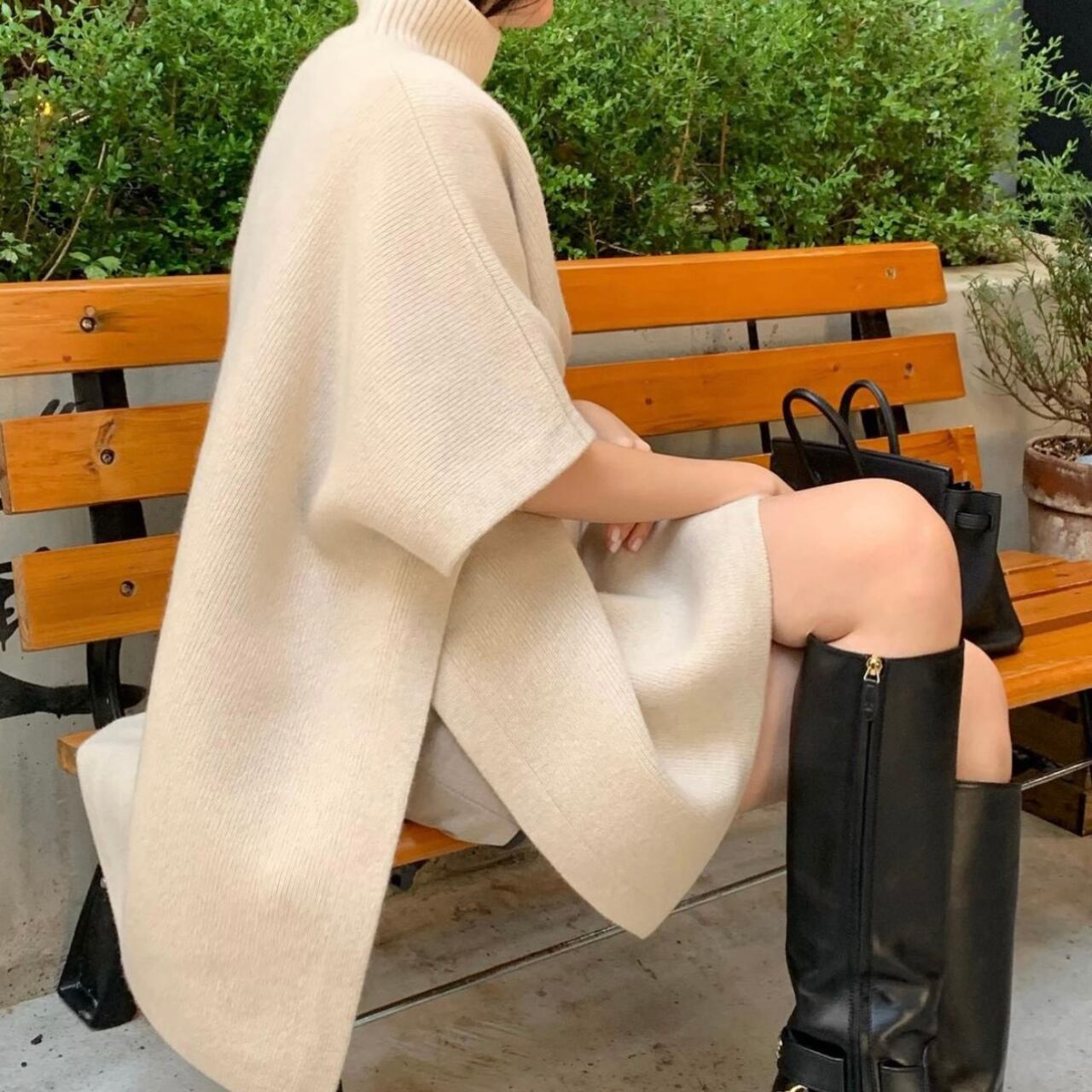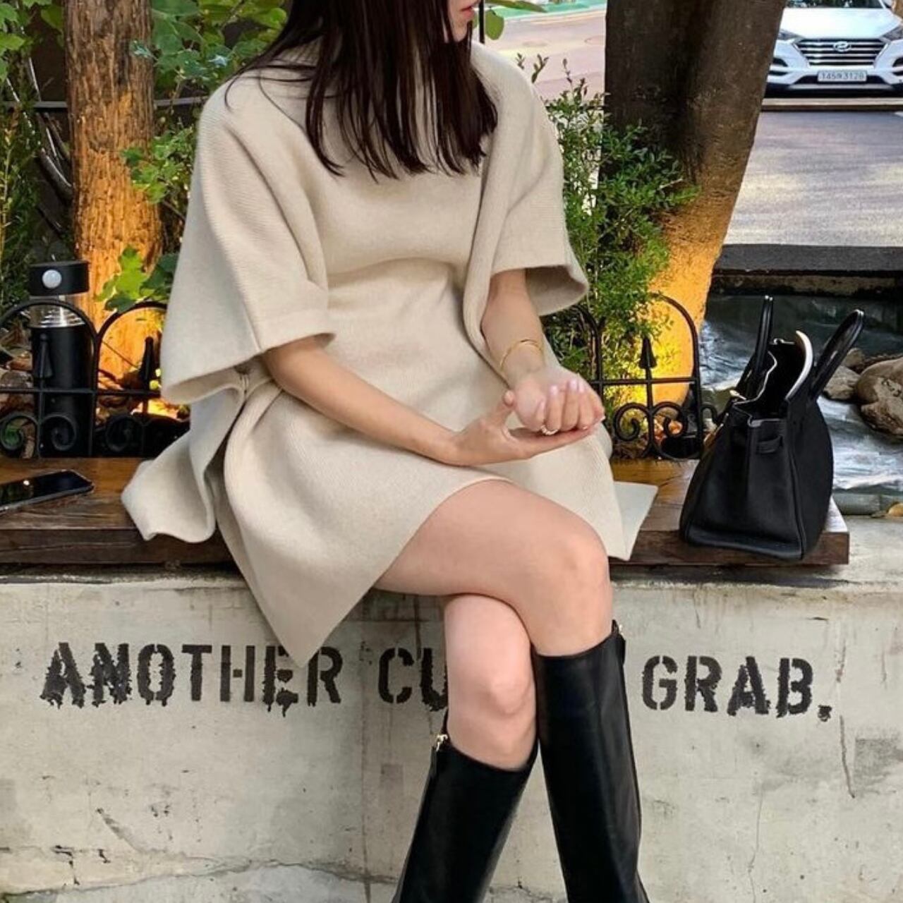 肩から流れるようなラインが、体型をカバーしながら女性らしい優雅さを演出。膝上の絶妙な丈感で、脚長効果とスタイルアップを実現します。