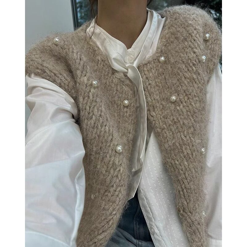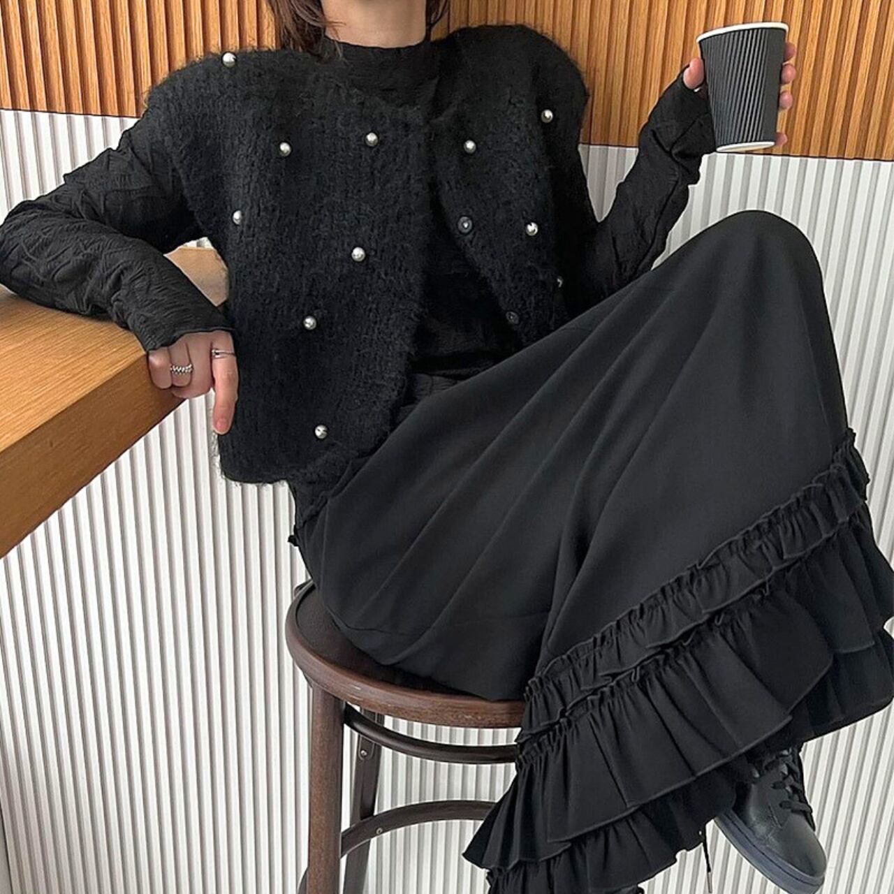 フロント全体に散りばめられた上品なパールビーズが、シンプルなコーディネートを一瞬で特別な装いに格上げ。光の当たり方によって表情を変える美しい輝きが、あなたの魅力を引き立てます。