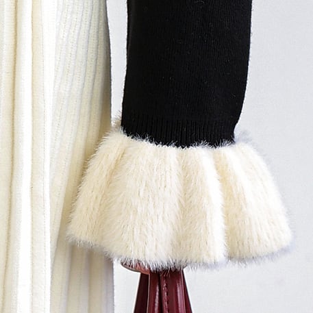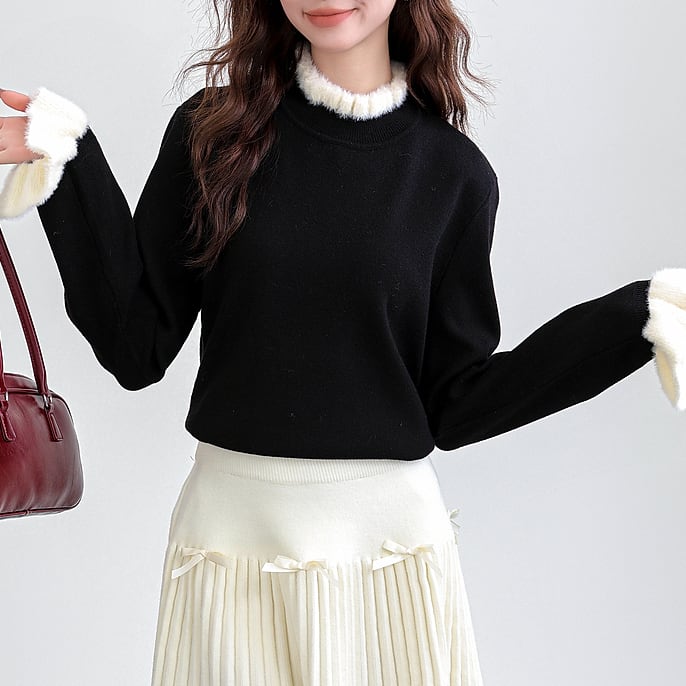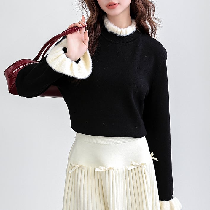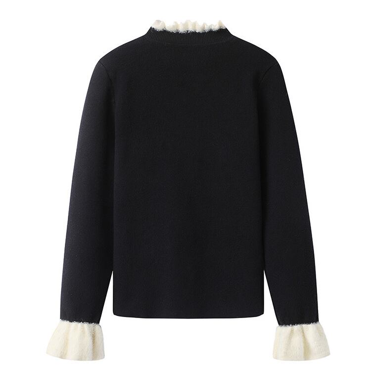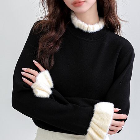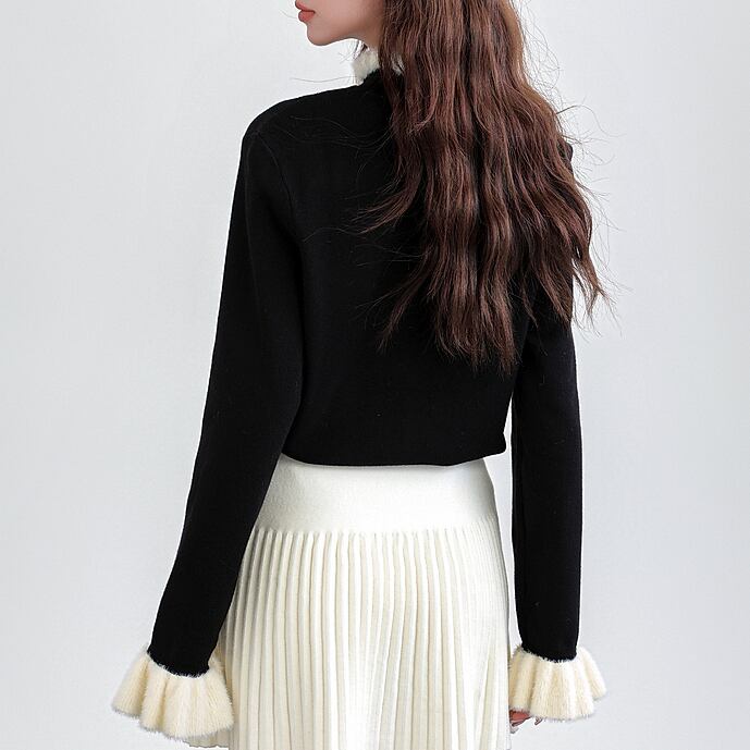 首元と袖口に施された、繊細なフリルデザインが印象的なハーフタートルネックセーター。