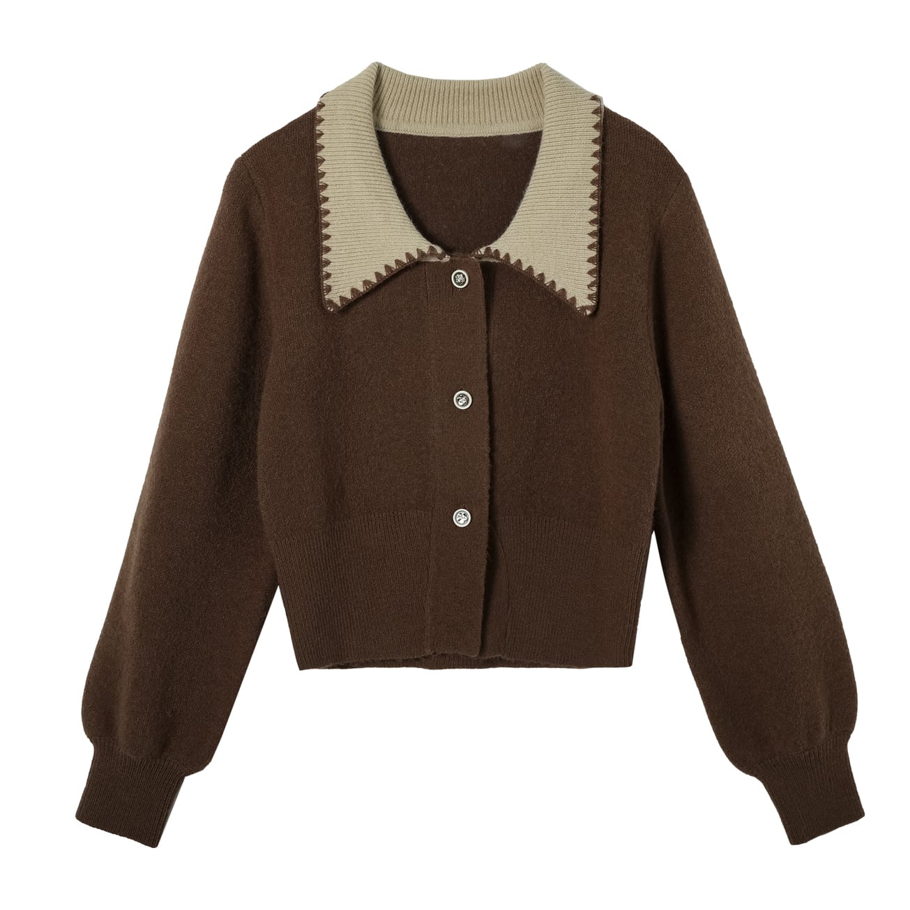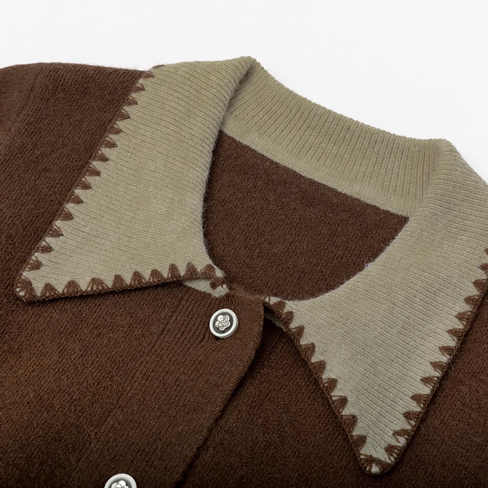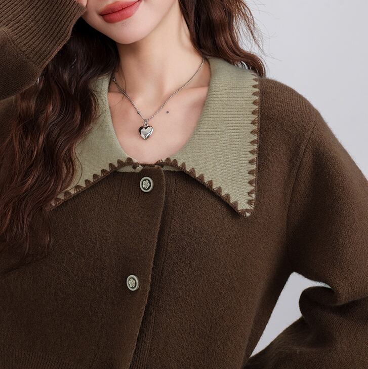 ブラウンとグリーンの絶妙な配色が目を惹く、ビッグカラーカーディガン。