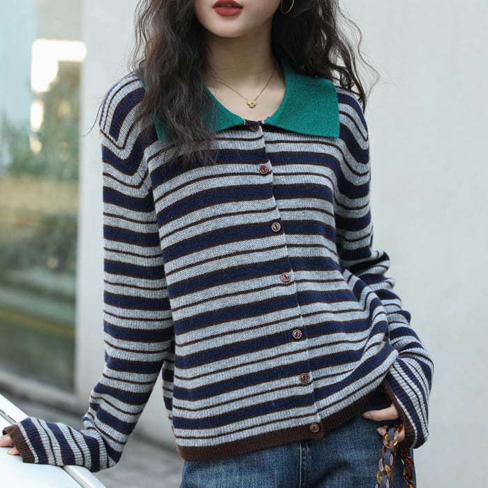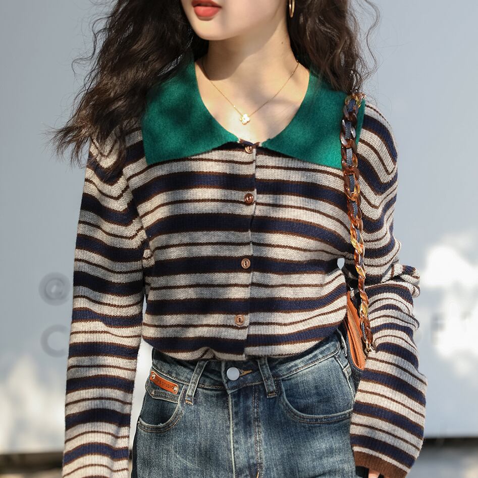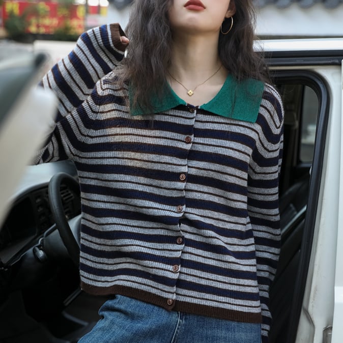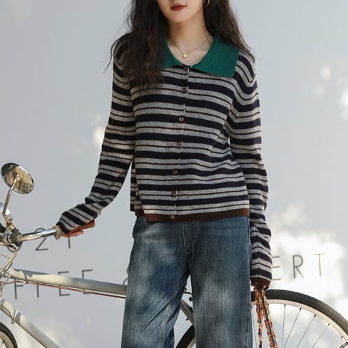 クラシカルなボーダーパターンに深みのあるカラーリングを効かせた、ポロネックカーディガン。