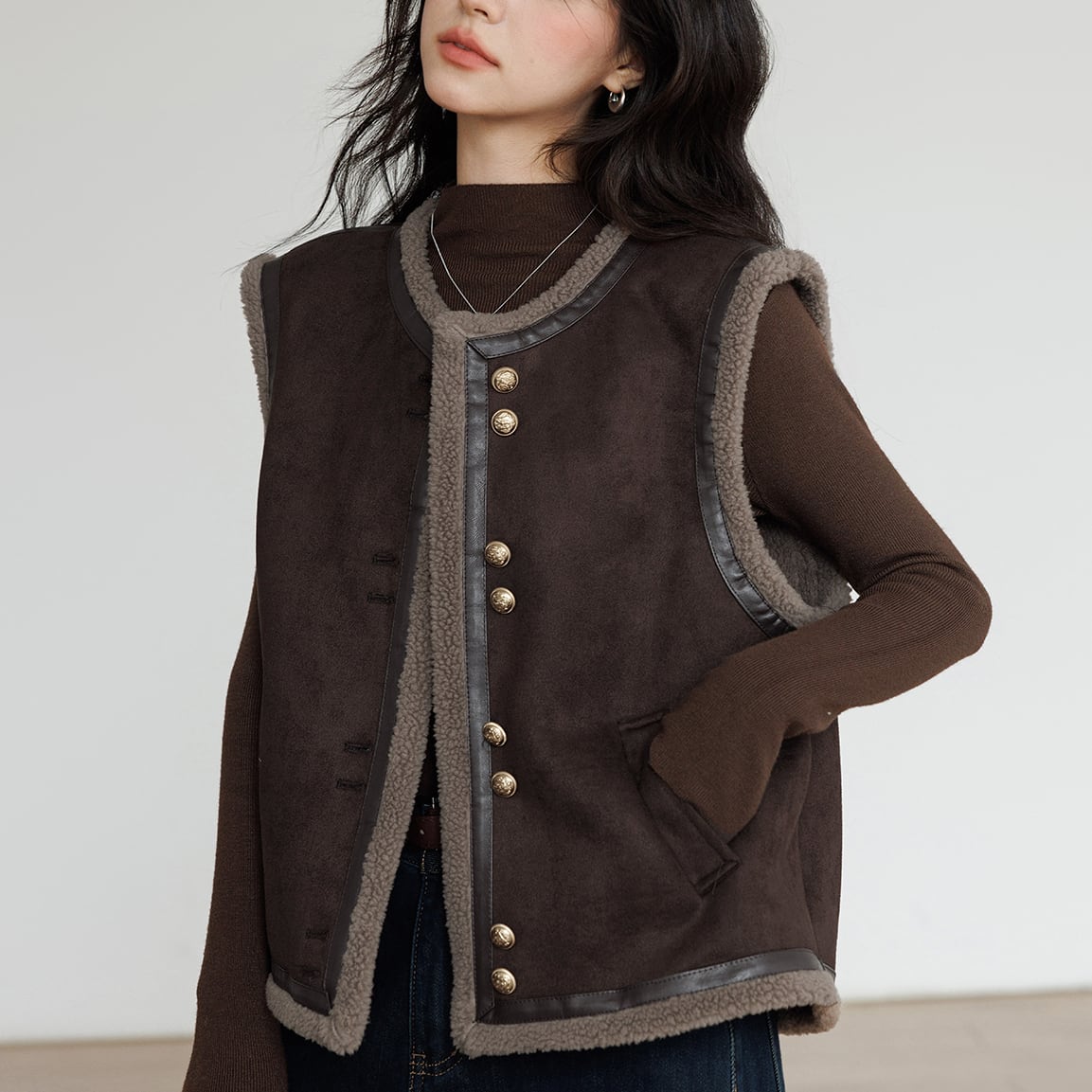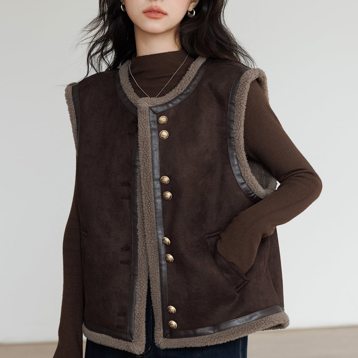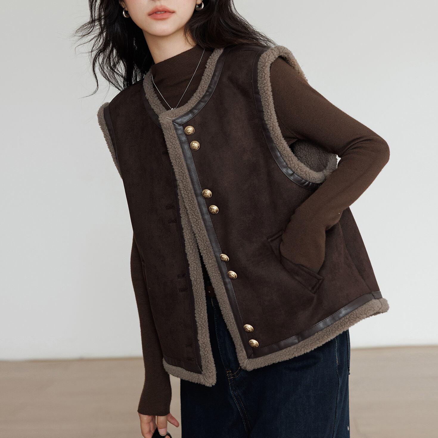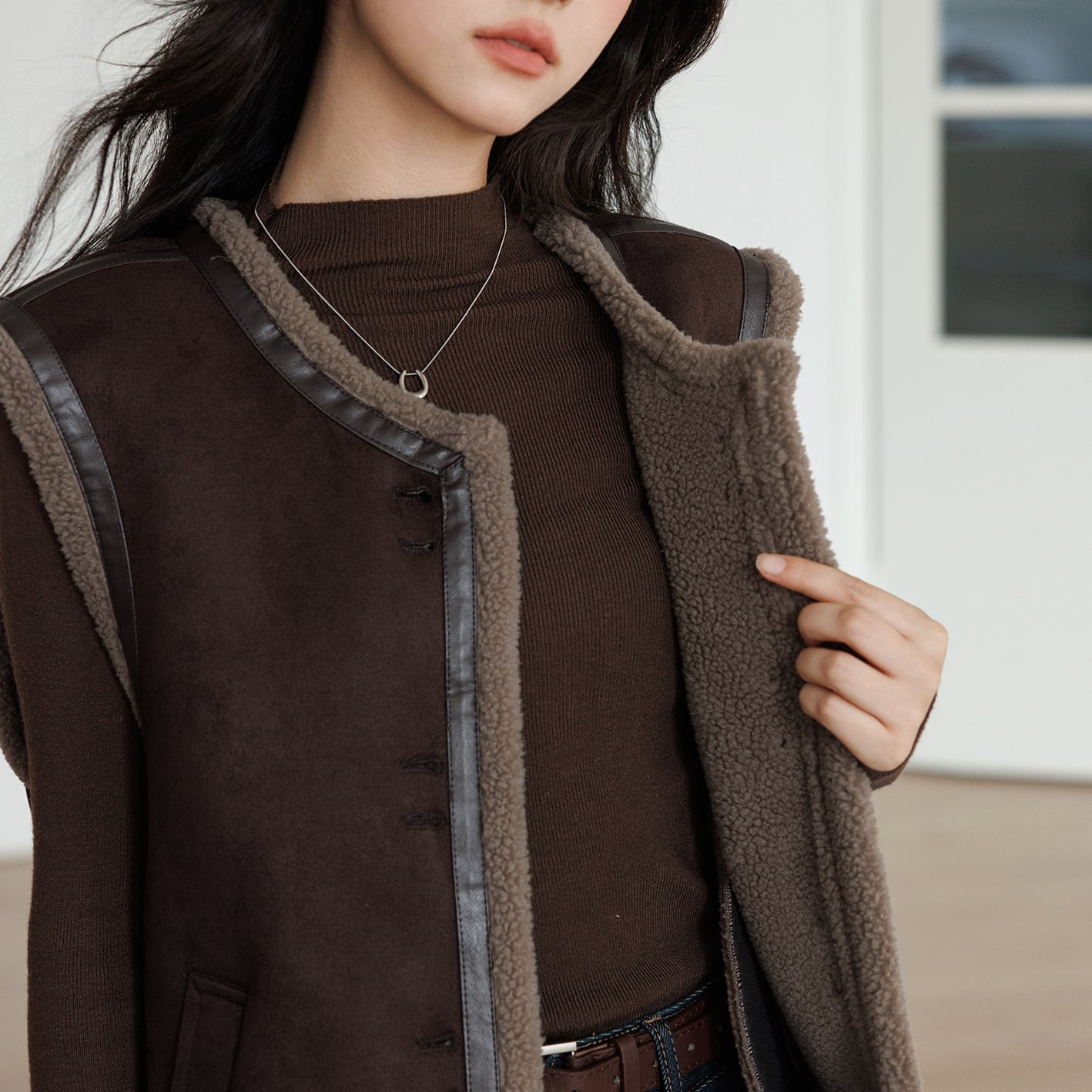 ブラウンカラーは、カジュアルなボア素材を大人っぽく見せる絶妙なカラー。