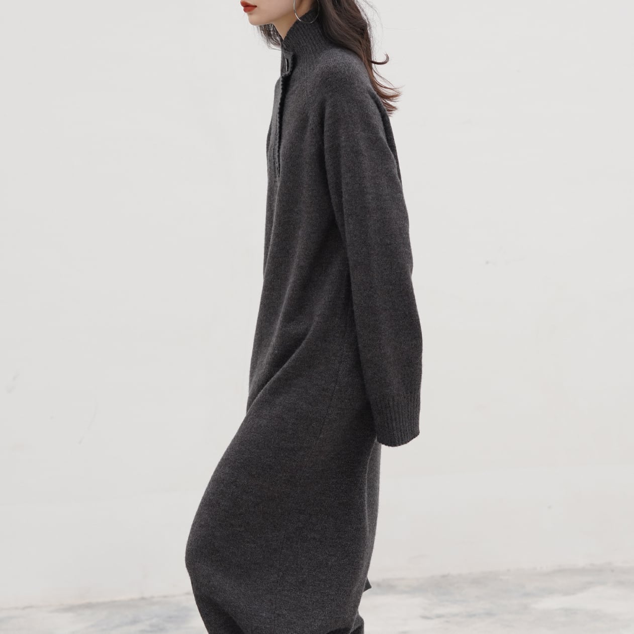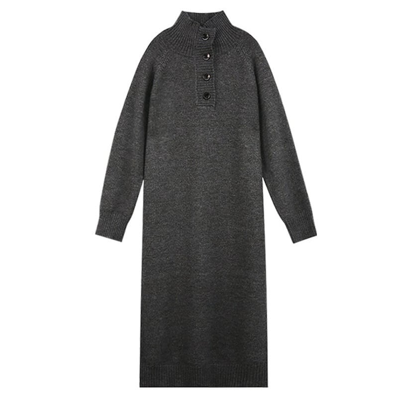 ハイネックのデザインとフロントボタンがアクセントとなったロングニットドレスです。