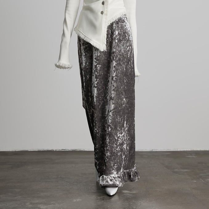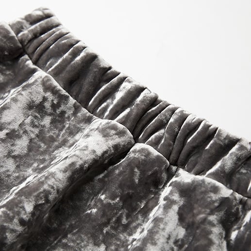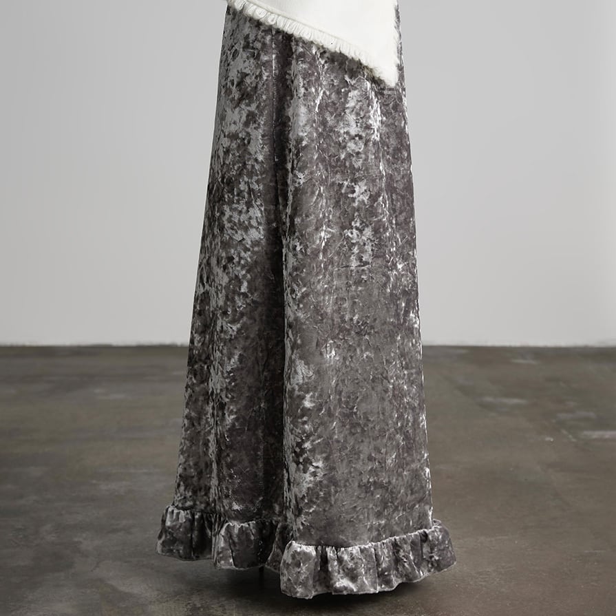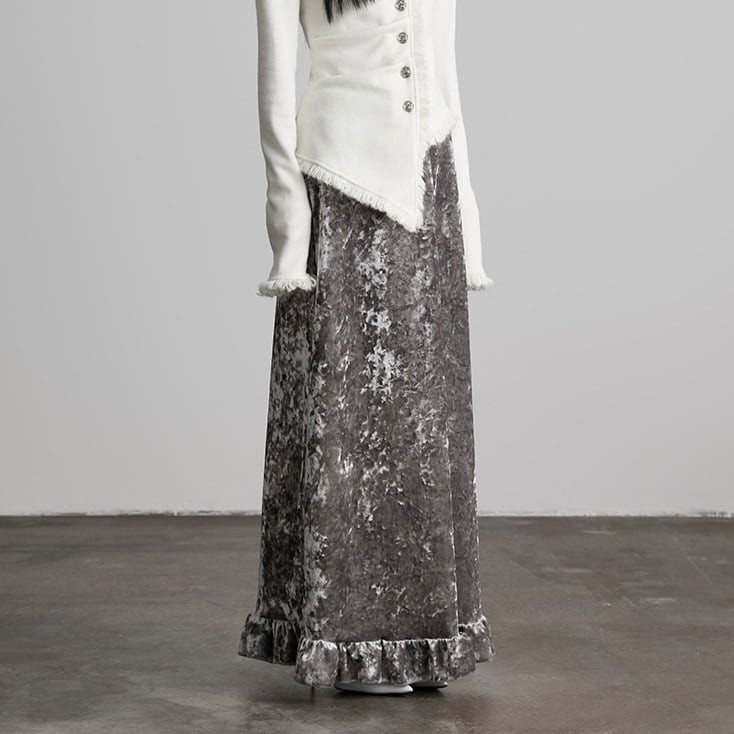 光の当たり方で表情を変える、独特の艶めきを放つベルベット素材のロングスカート。