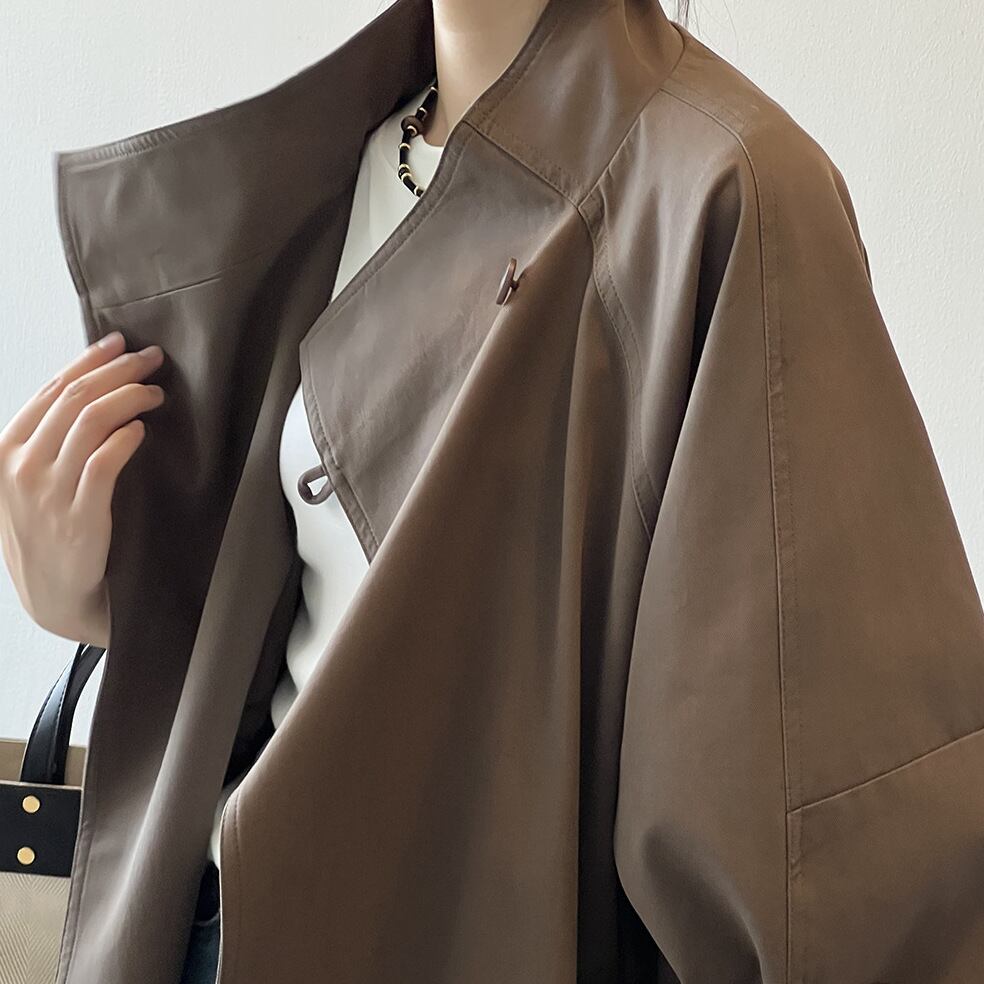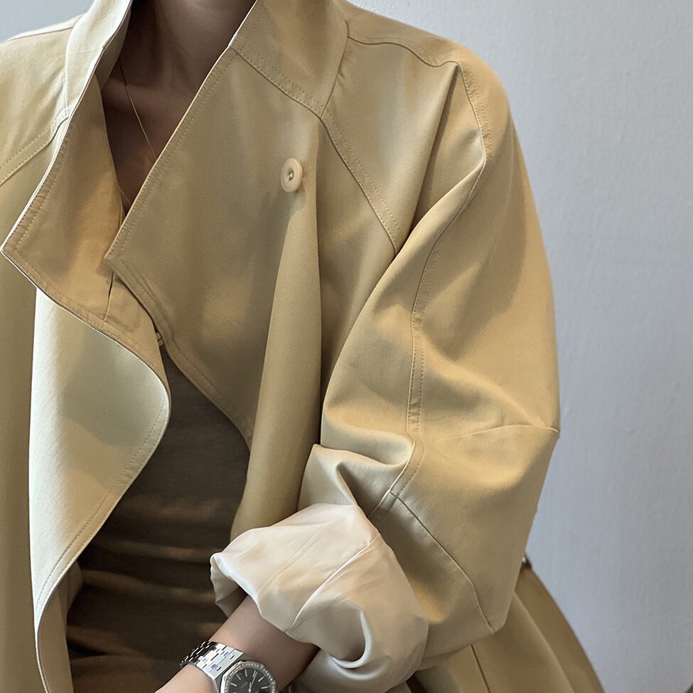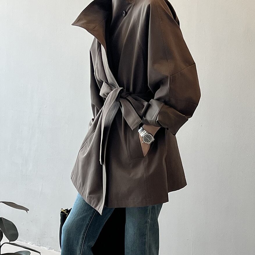 クラシックなトレンチコートのディテールを残しながら、現代的なショート丈にアップデート。