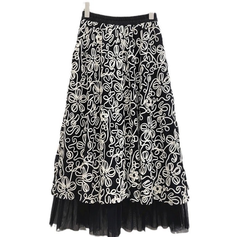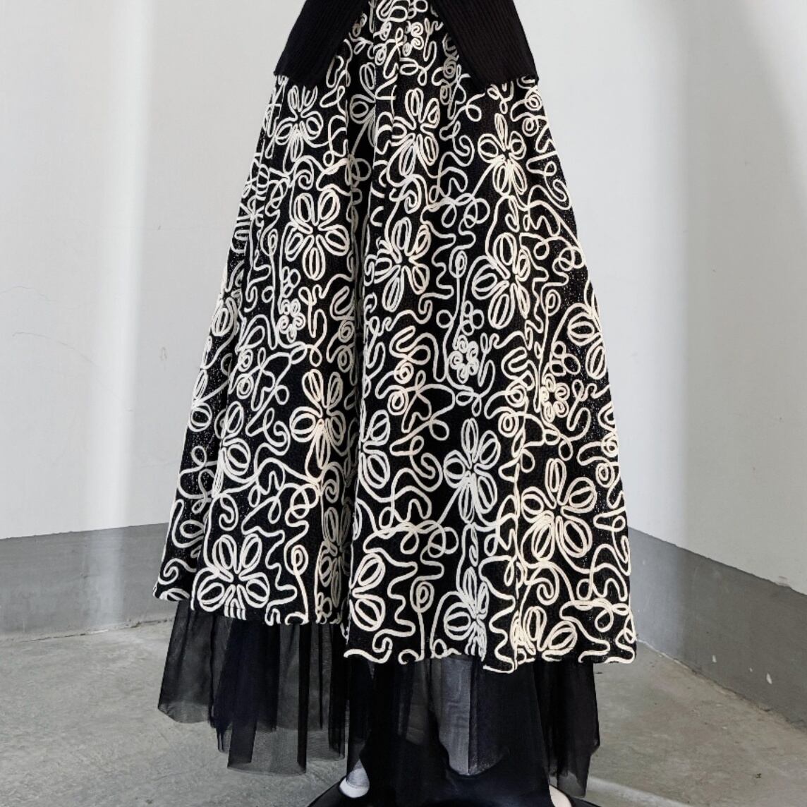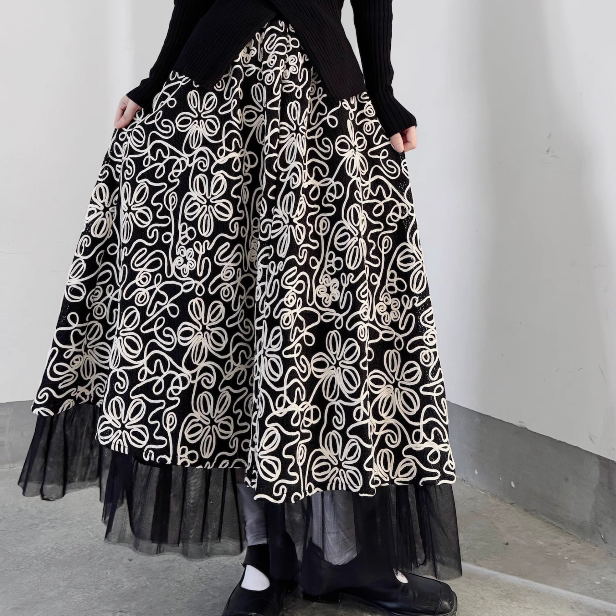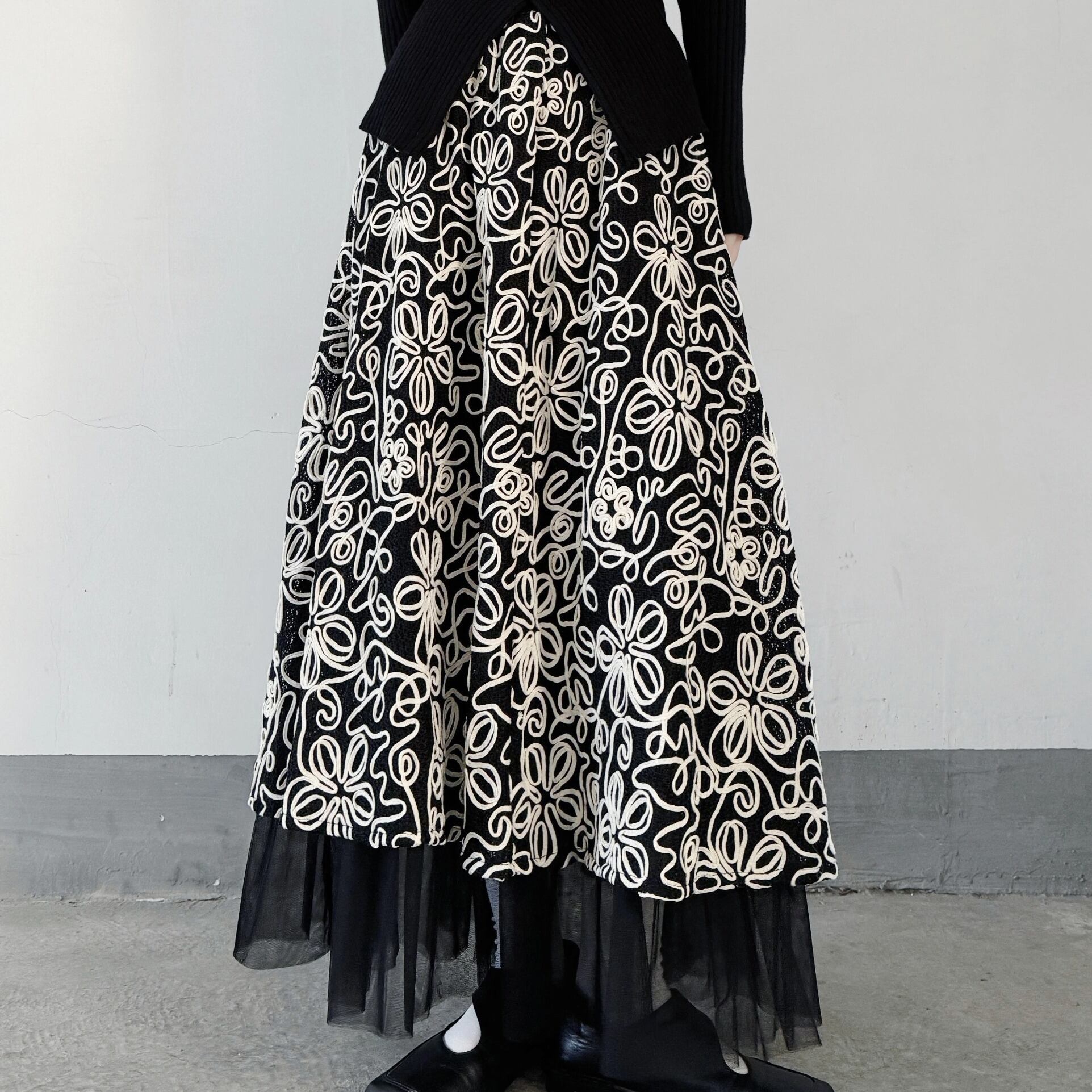 繊細なフラワー刺繍が全面に広がる、アート作品のようなレイヤースカート。