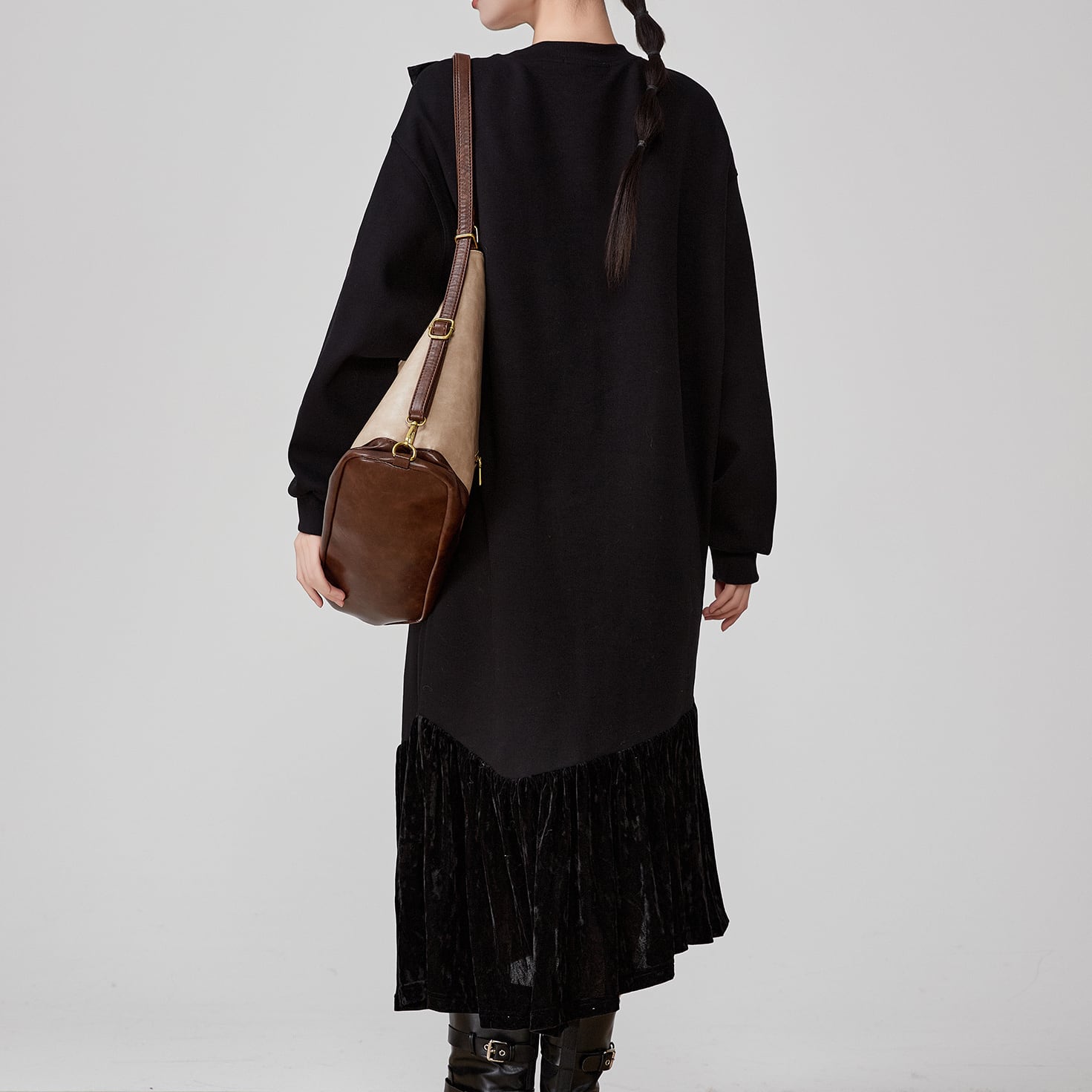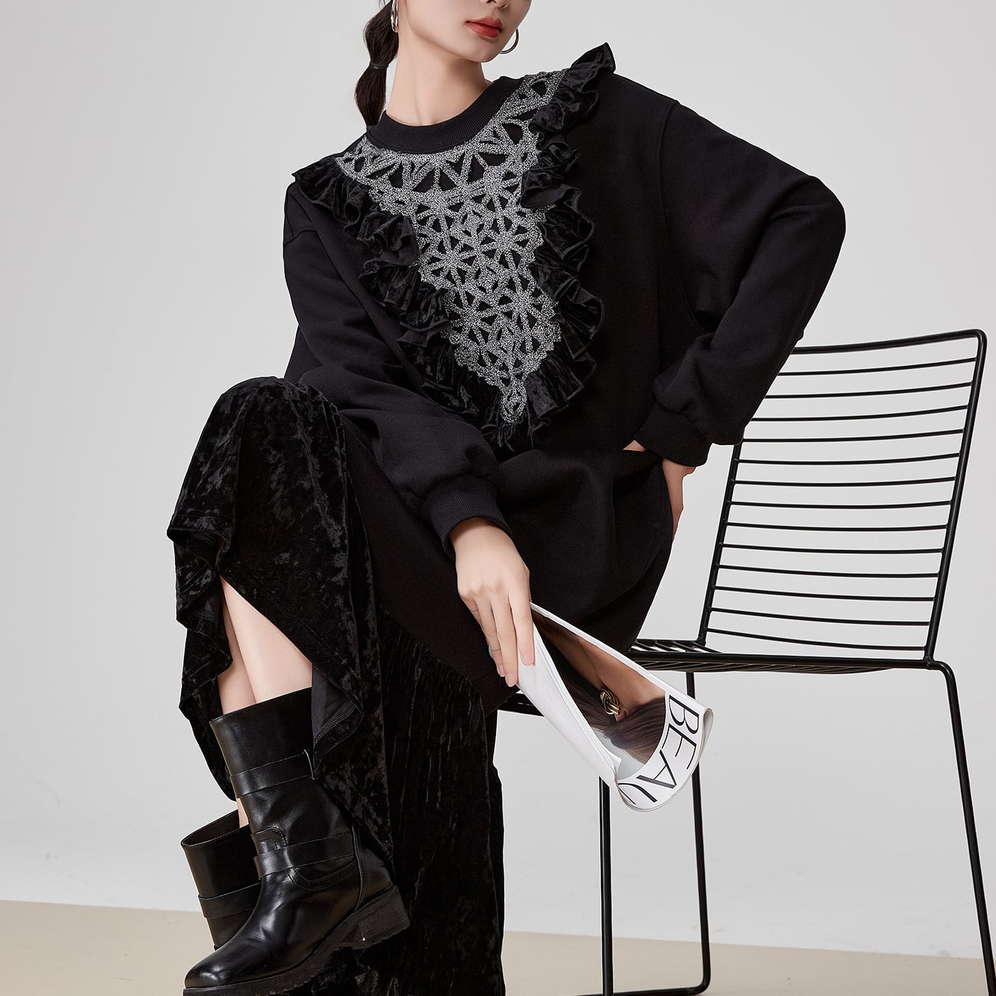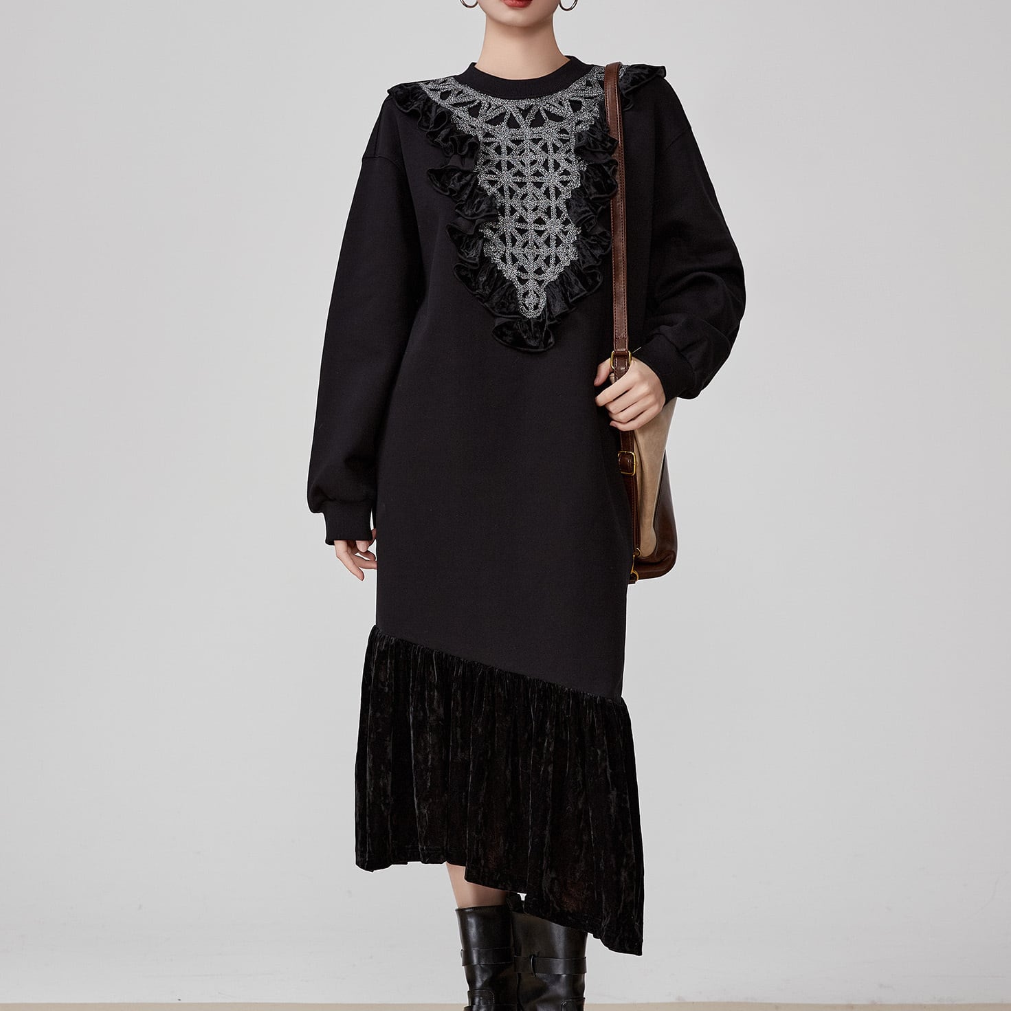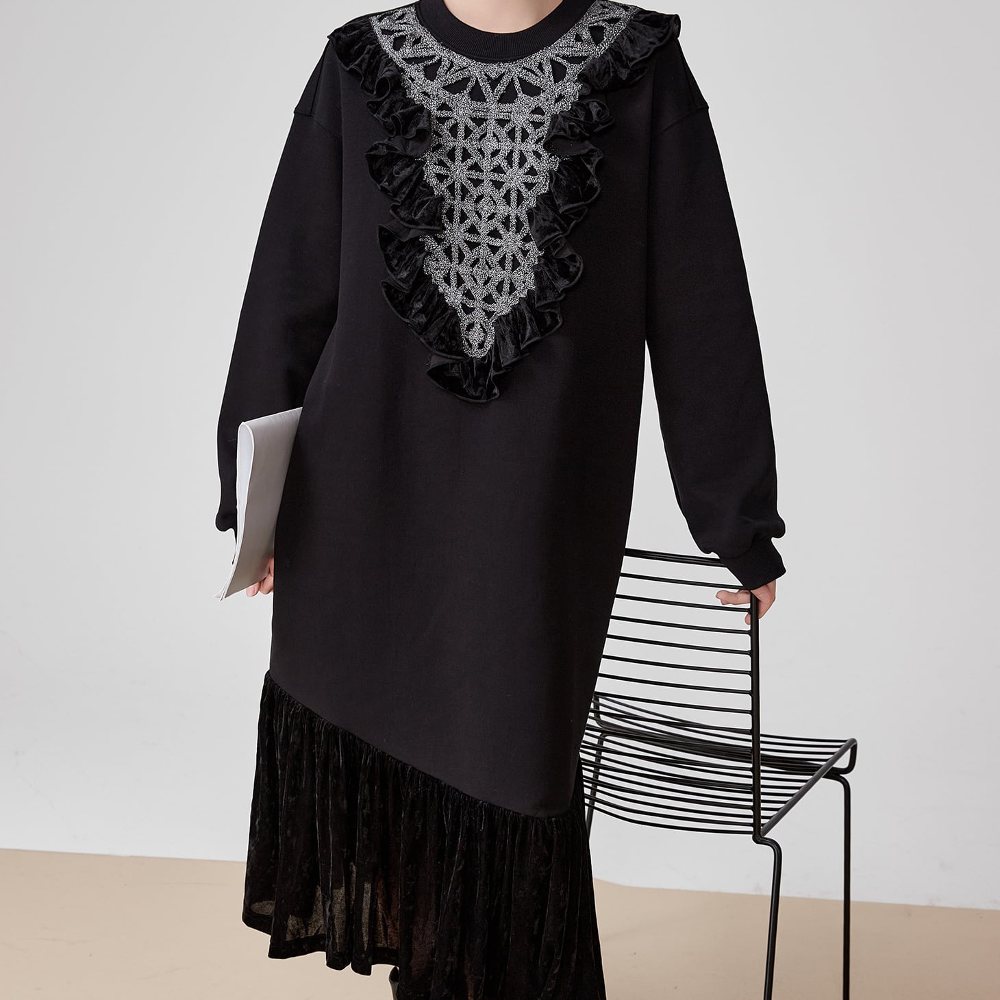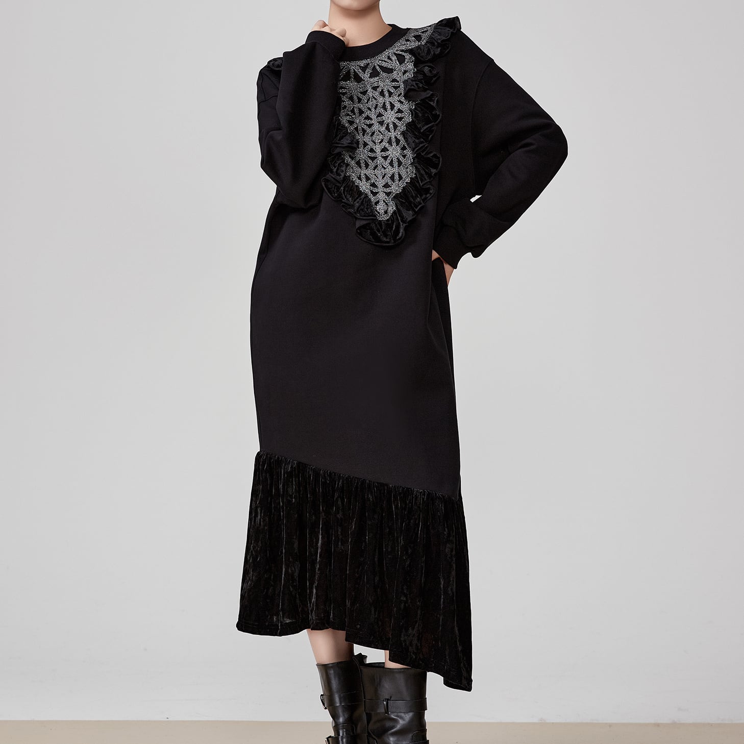 シンプルなブラックベースに胸元のラッフルデザインがアクセントになったワンピース。