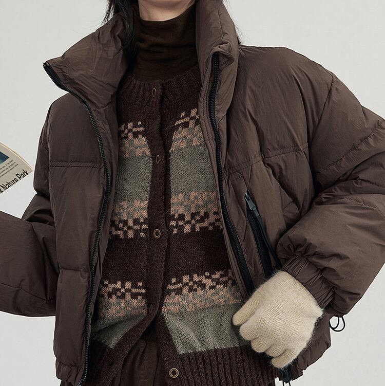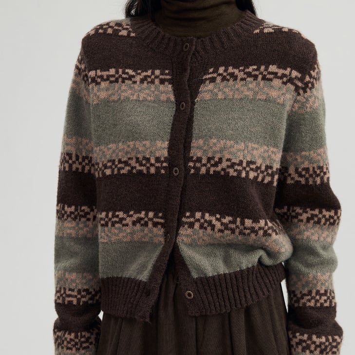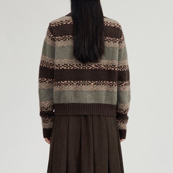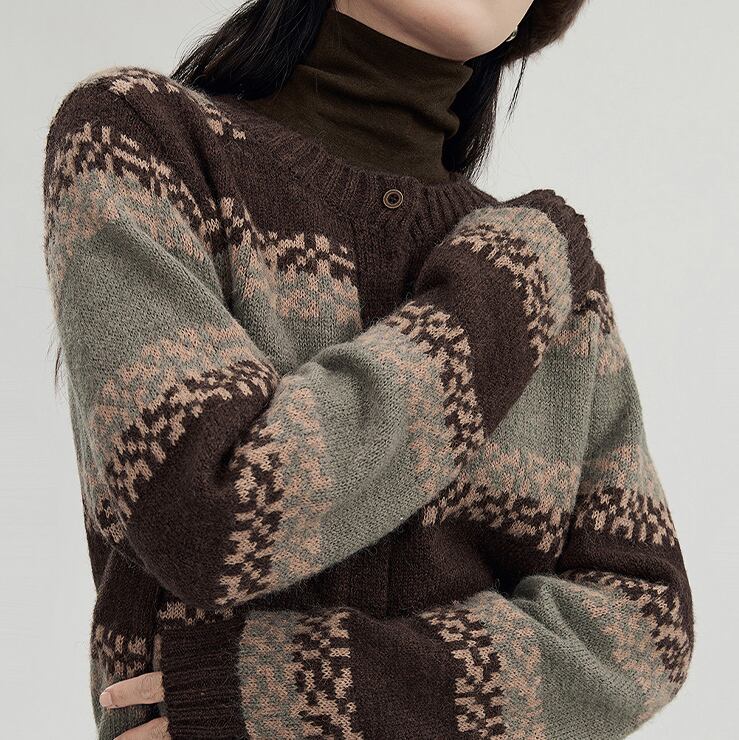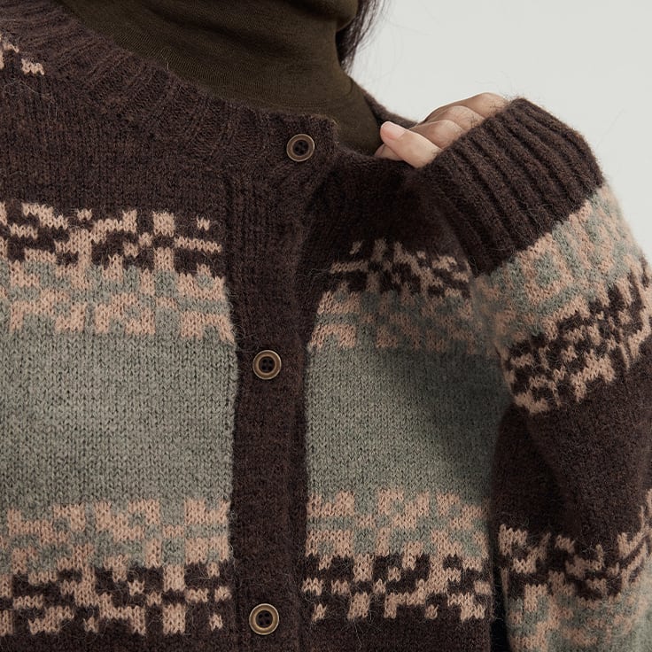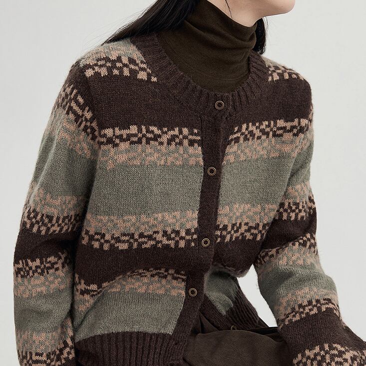 ブラウン、グリーン、ベージュ。大地を思わせるアースカラーが、絶妙なバランスで重なり合うニットカーディガン。