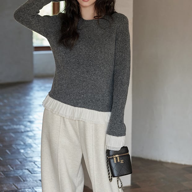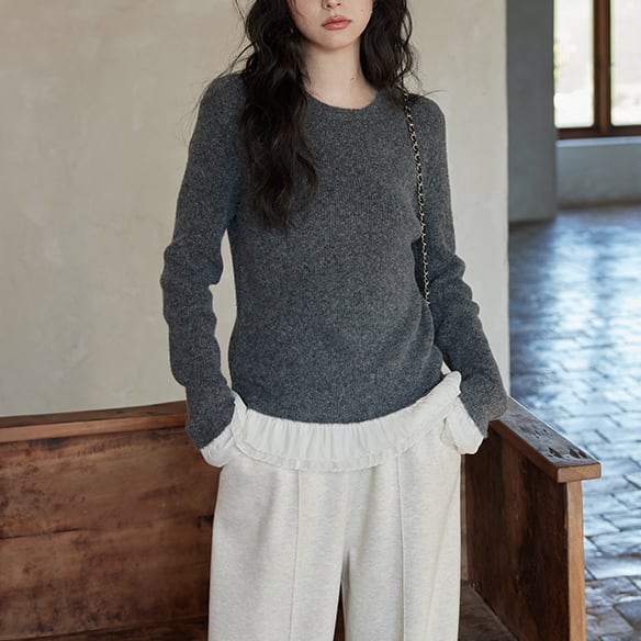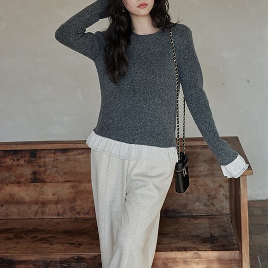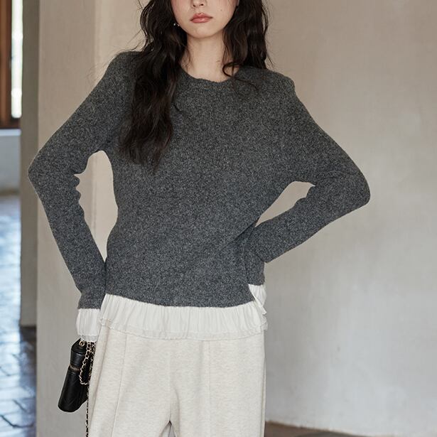 裾のフリルデザインがオシャレなラウンドネックニットです。