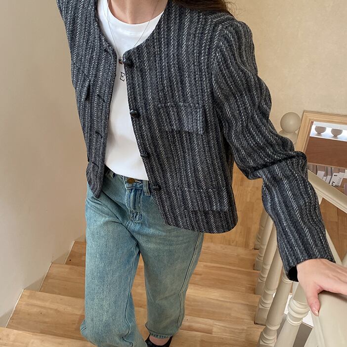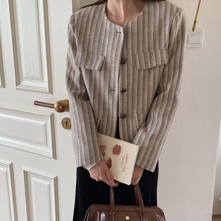 ノーカラーのデザインがオシャレなストライプジャケット。
