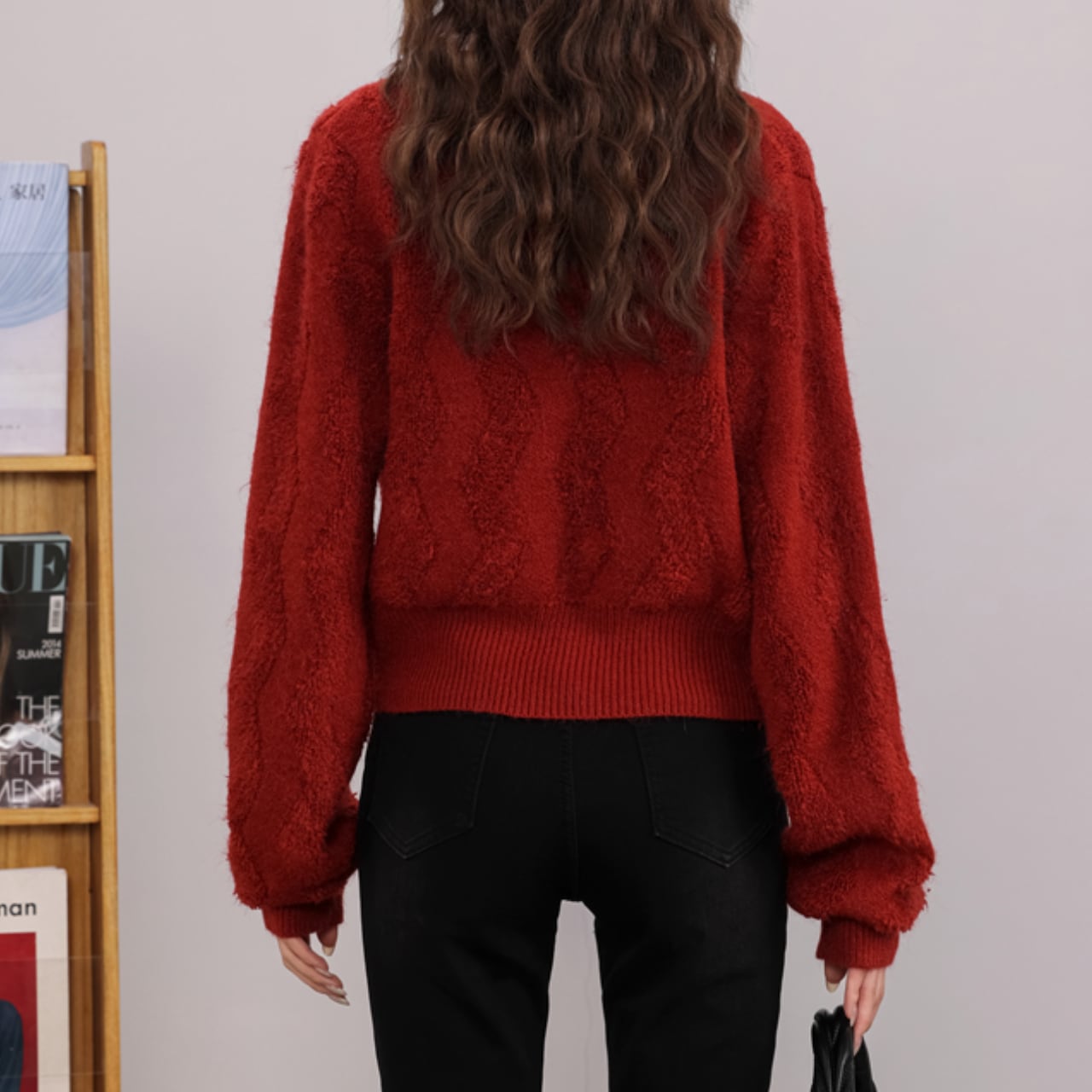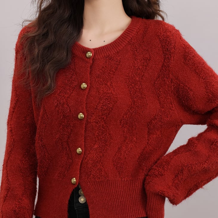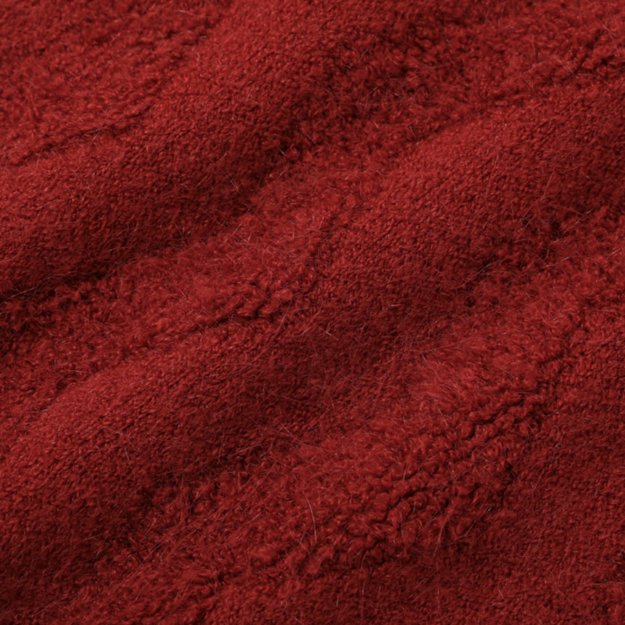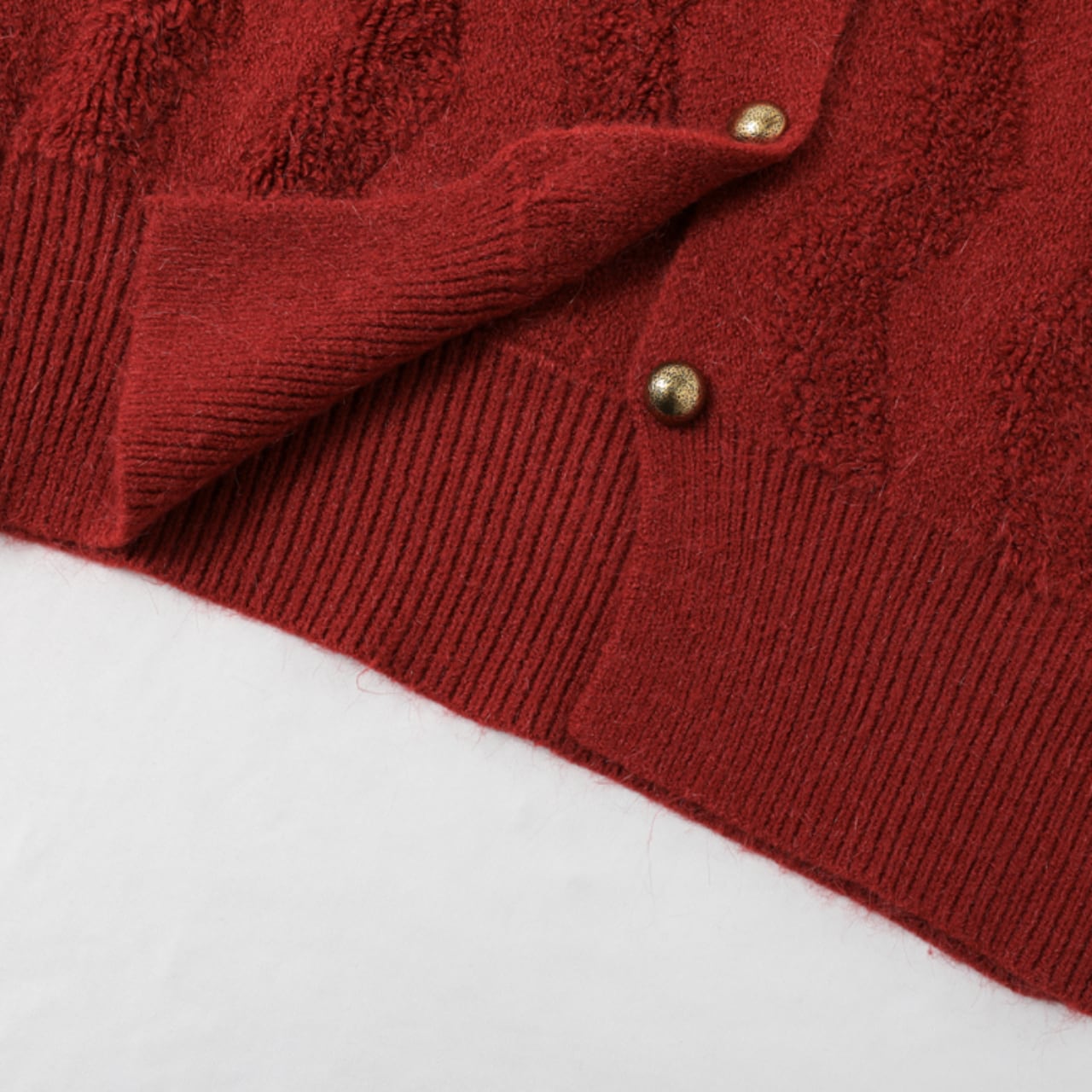 深みのあるボルドーレッドに、ジグザグの立体的なニットパターンが映える個性派カーディガン。