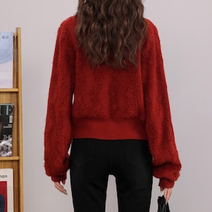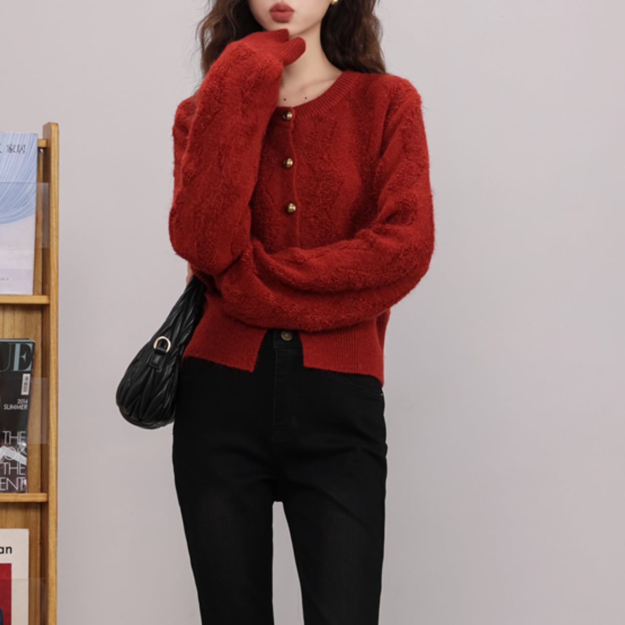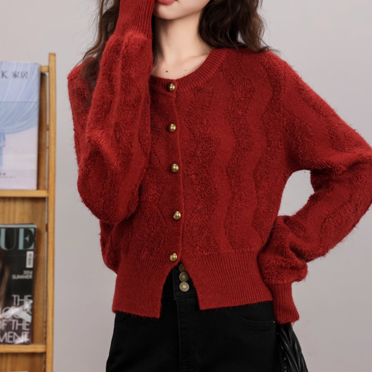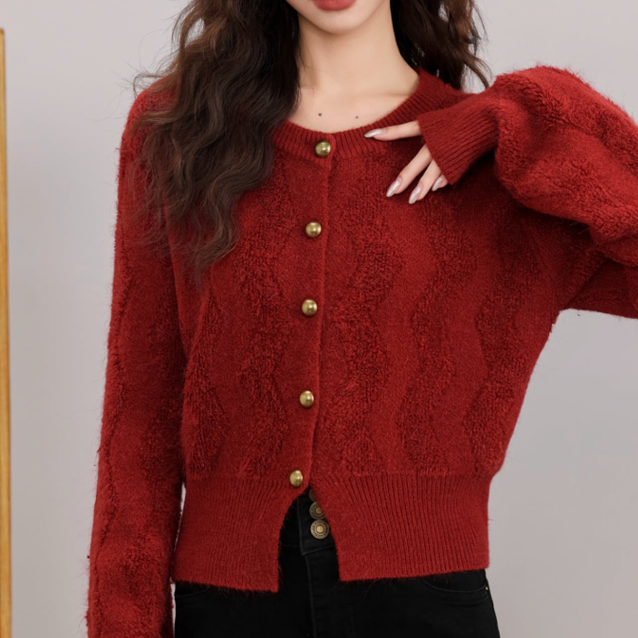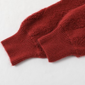 深みのあるボルドーレッドに、ジグザグの立体的なニットパターンが映える個性派カーディガン。