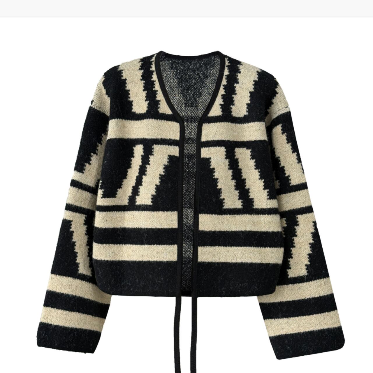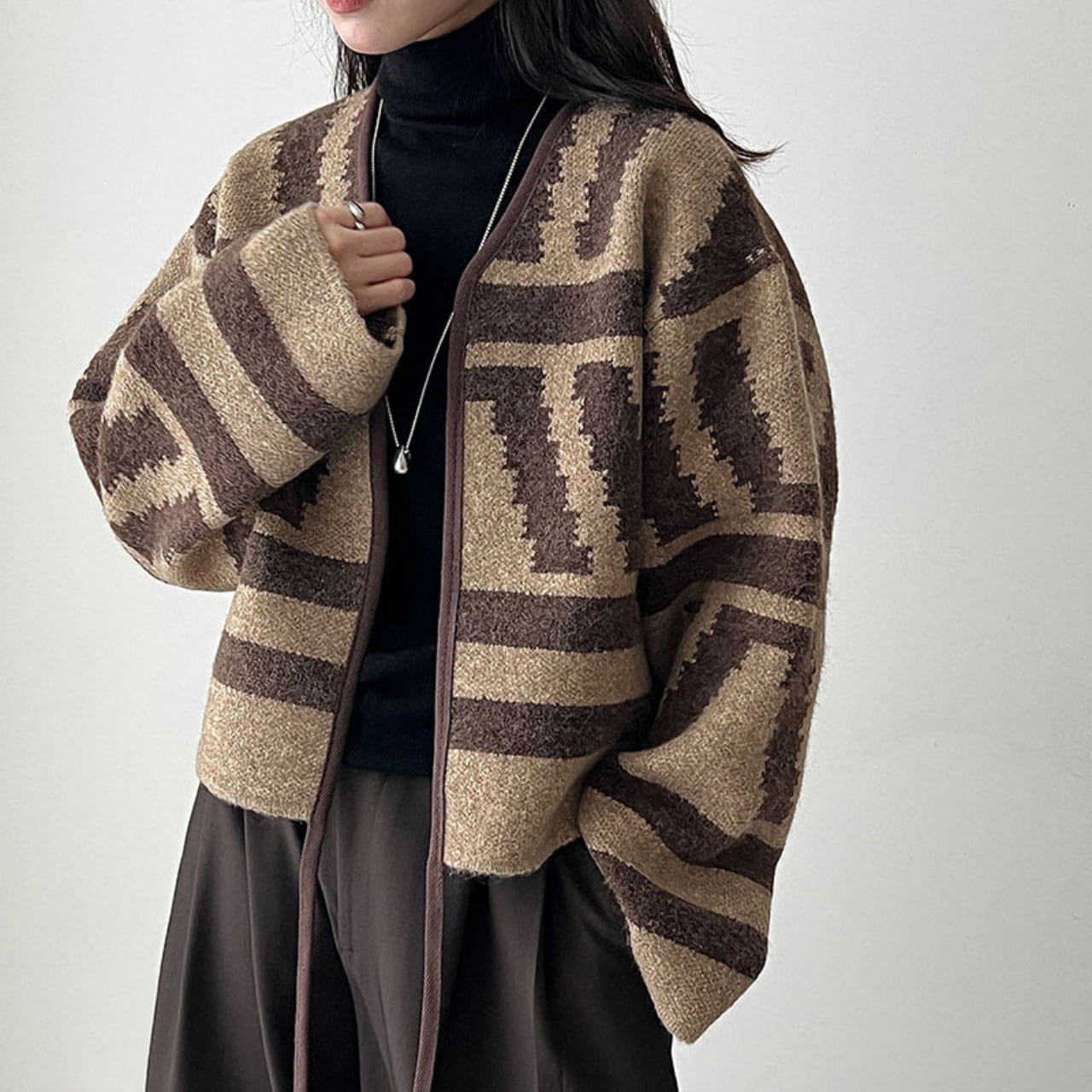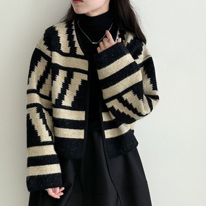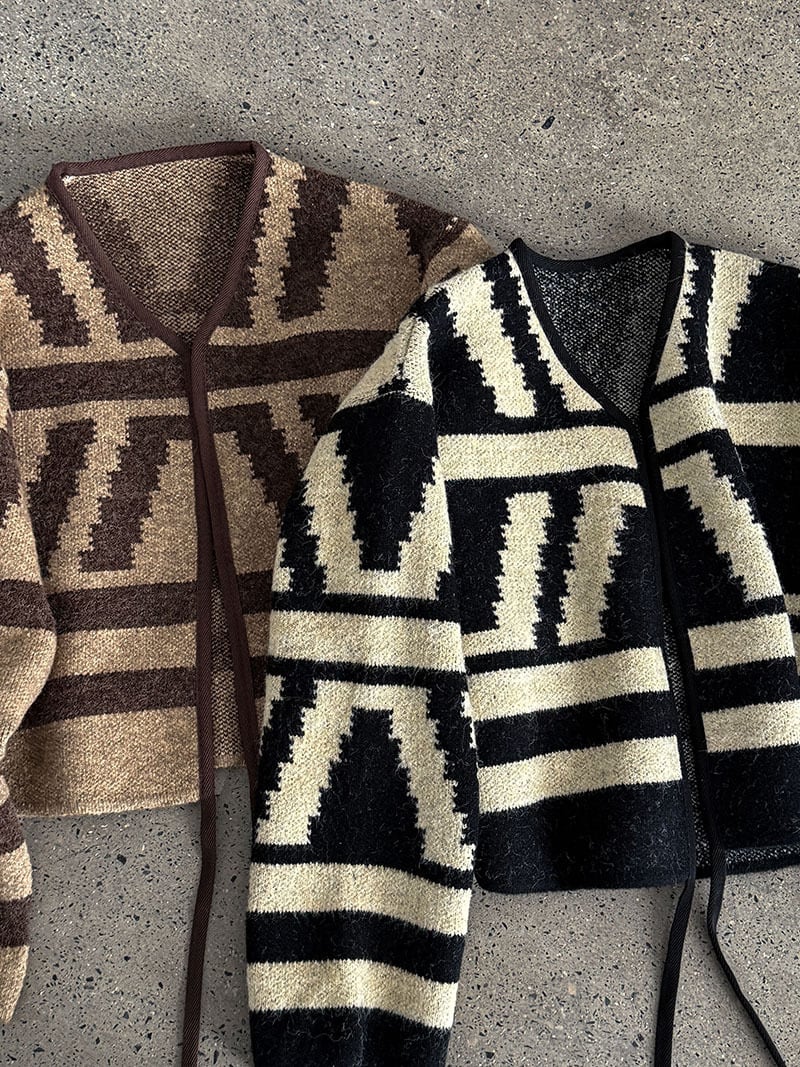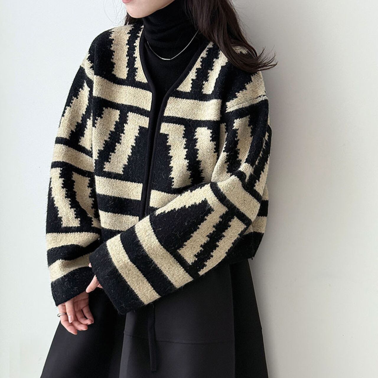 直線と面で描かれた幾何学パターンが、着る人をスタイリッシュに演出するカーディガン。