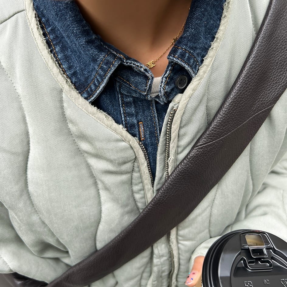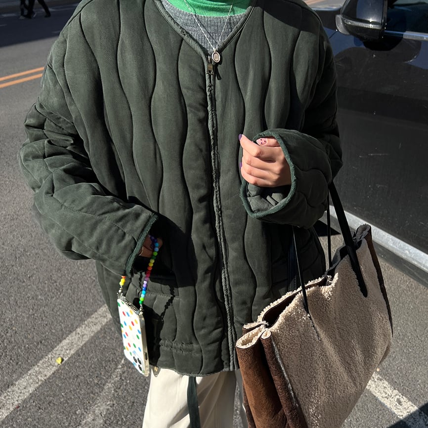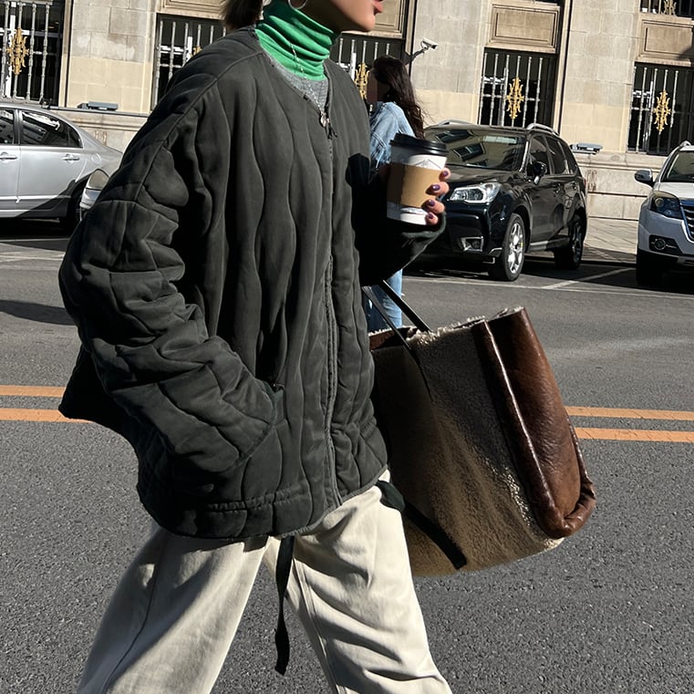 襟を削ぎ落としたミニマルなデザインがおしゃれなキルティングジャケット。