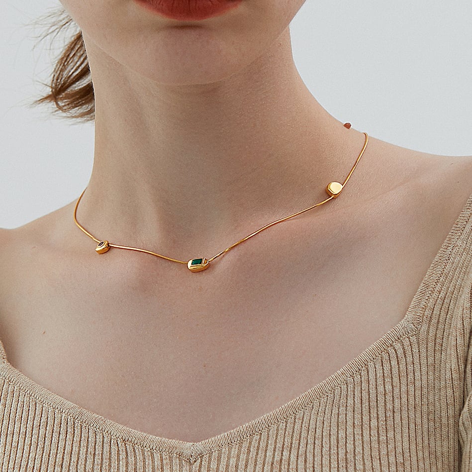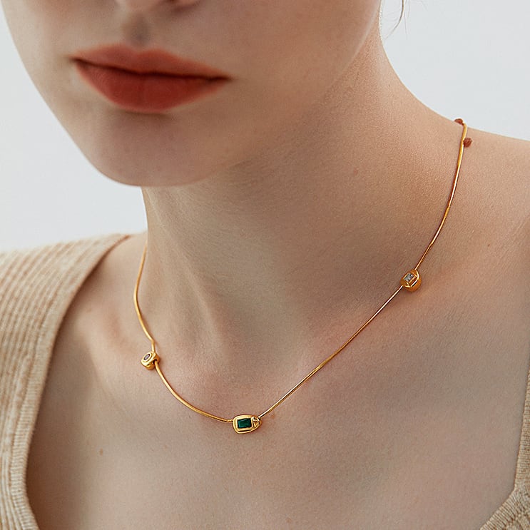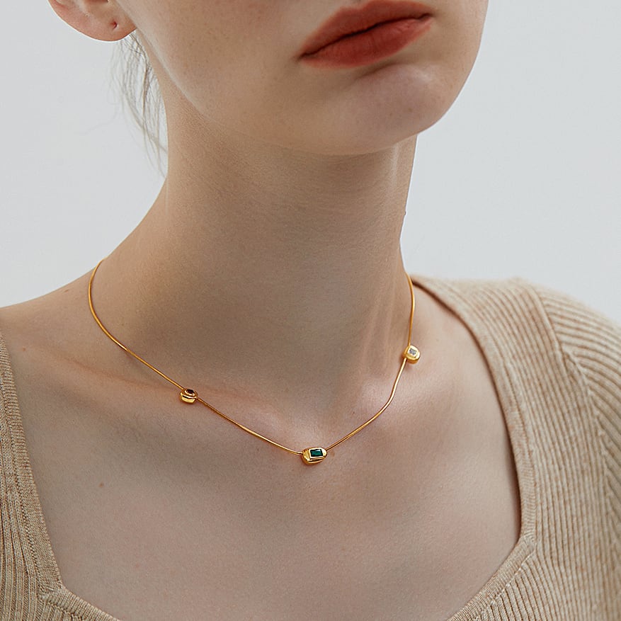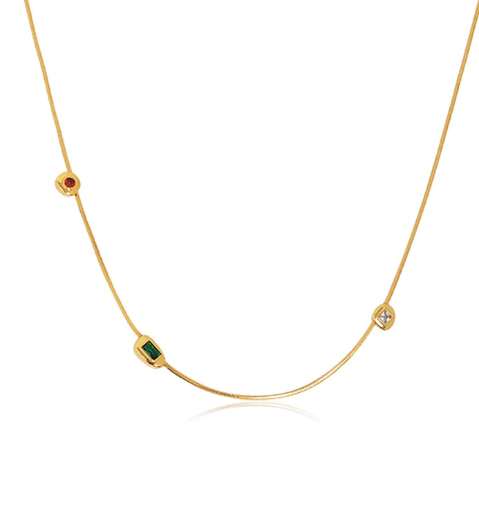 繊細なゴールドチェーンに、カラフルな小粒のパーツが等間隔に散りばめられた可憐なネックレス。