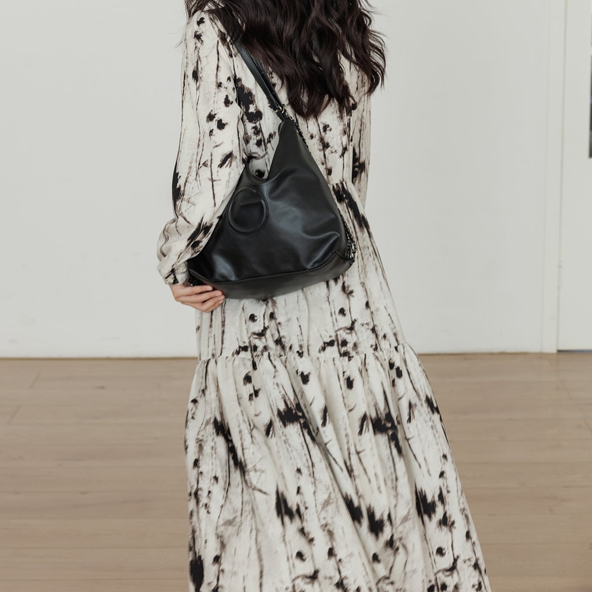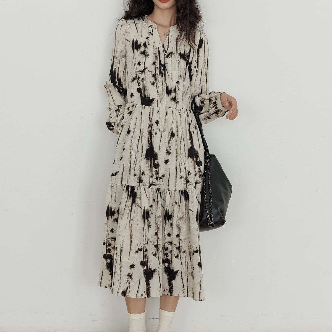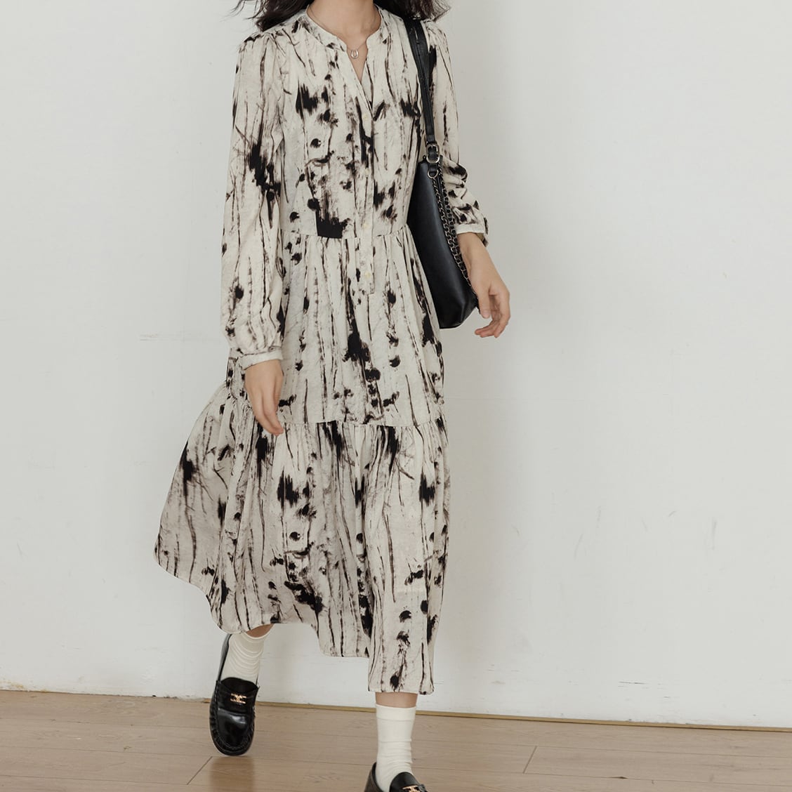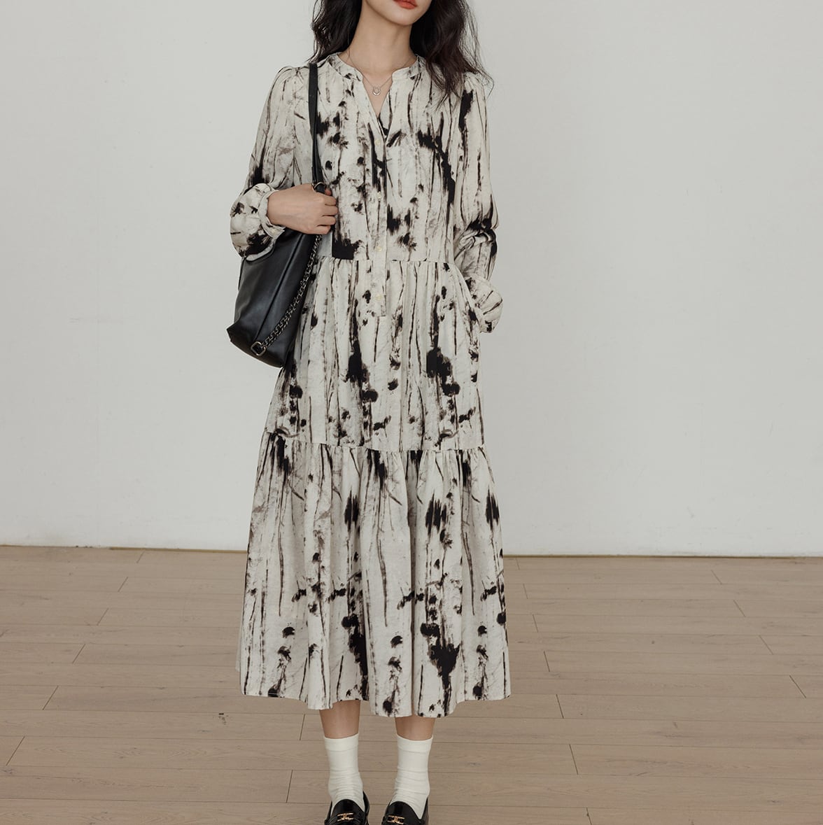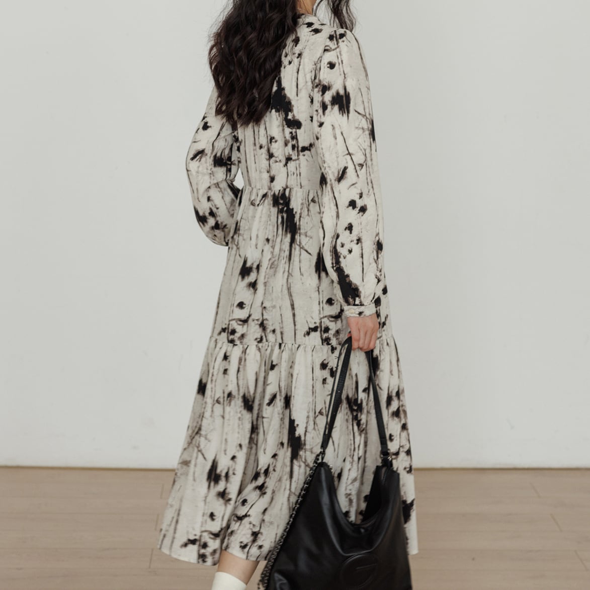 ゆったりとしたシルエットは、ティアードデザインで裾に向かって広がり、歩くたびにふわりと揺れる優雅さ。