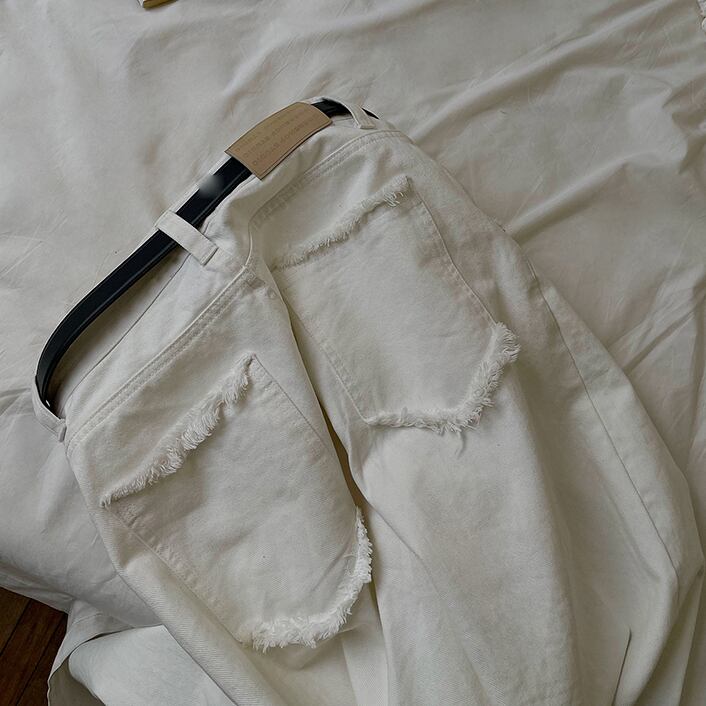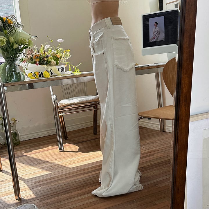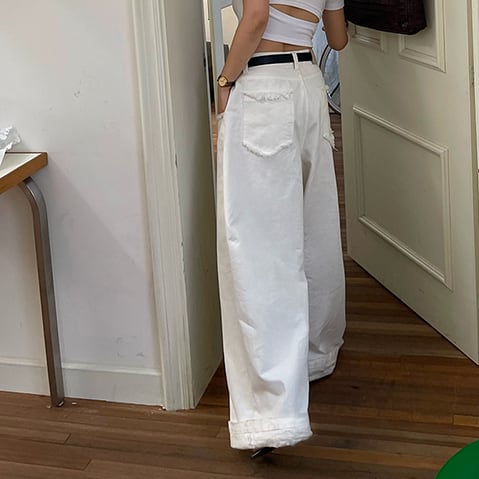 ホワイトのローエッジデザインがオシャレなワイドレッグパンツ。