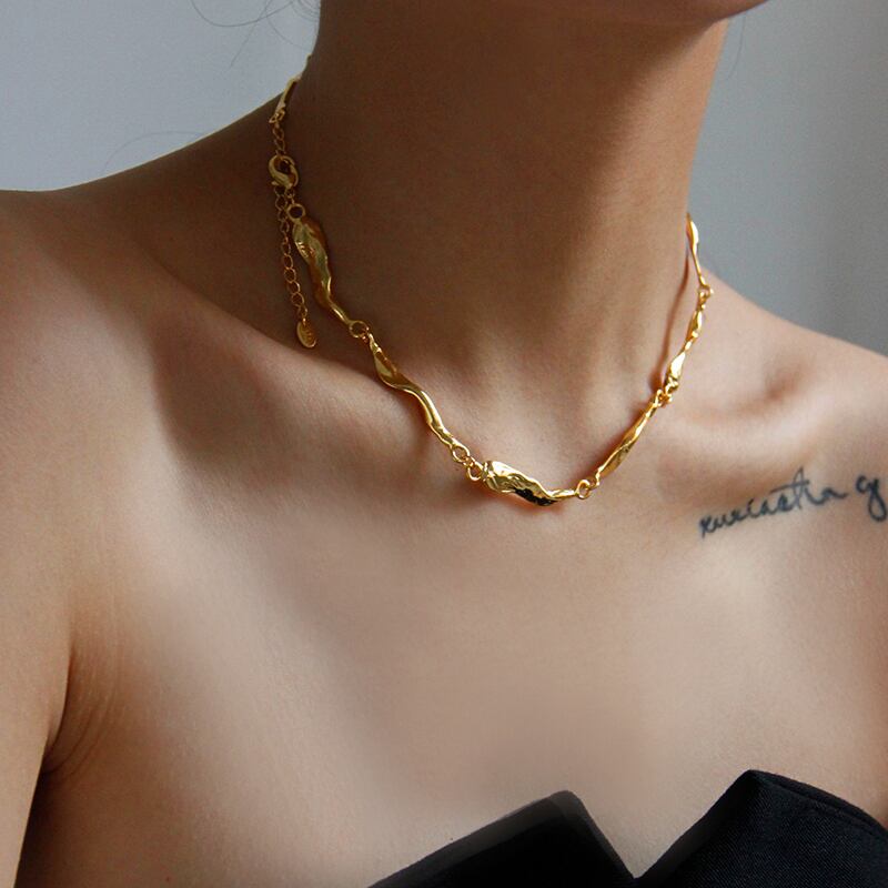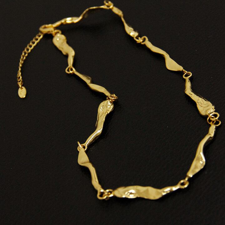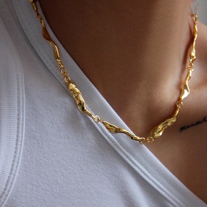 一本のチェーンでありながら、ひねりを加えることで立体的な表情を持ち、光の当たり方によって表情を変える計算されたデザインです。