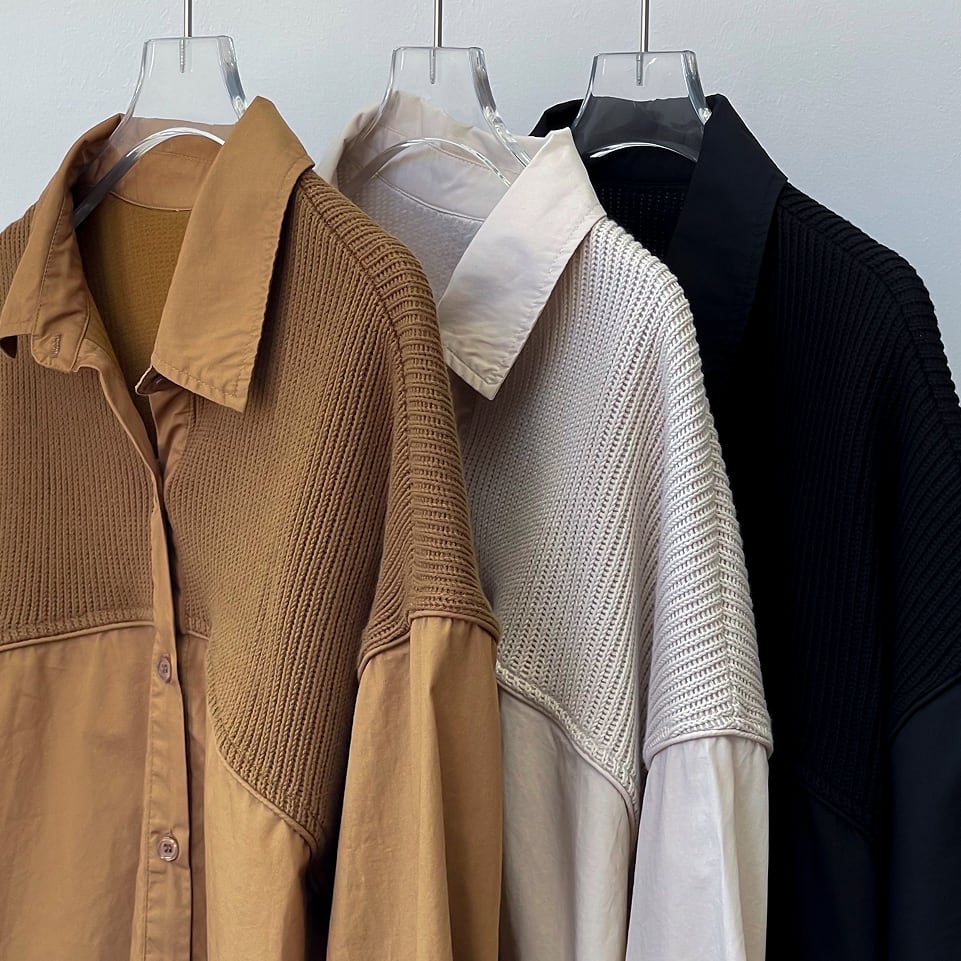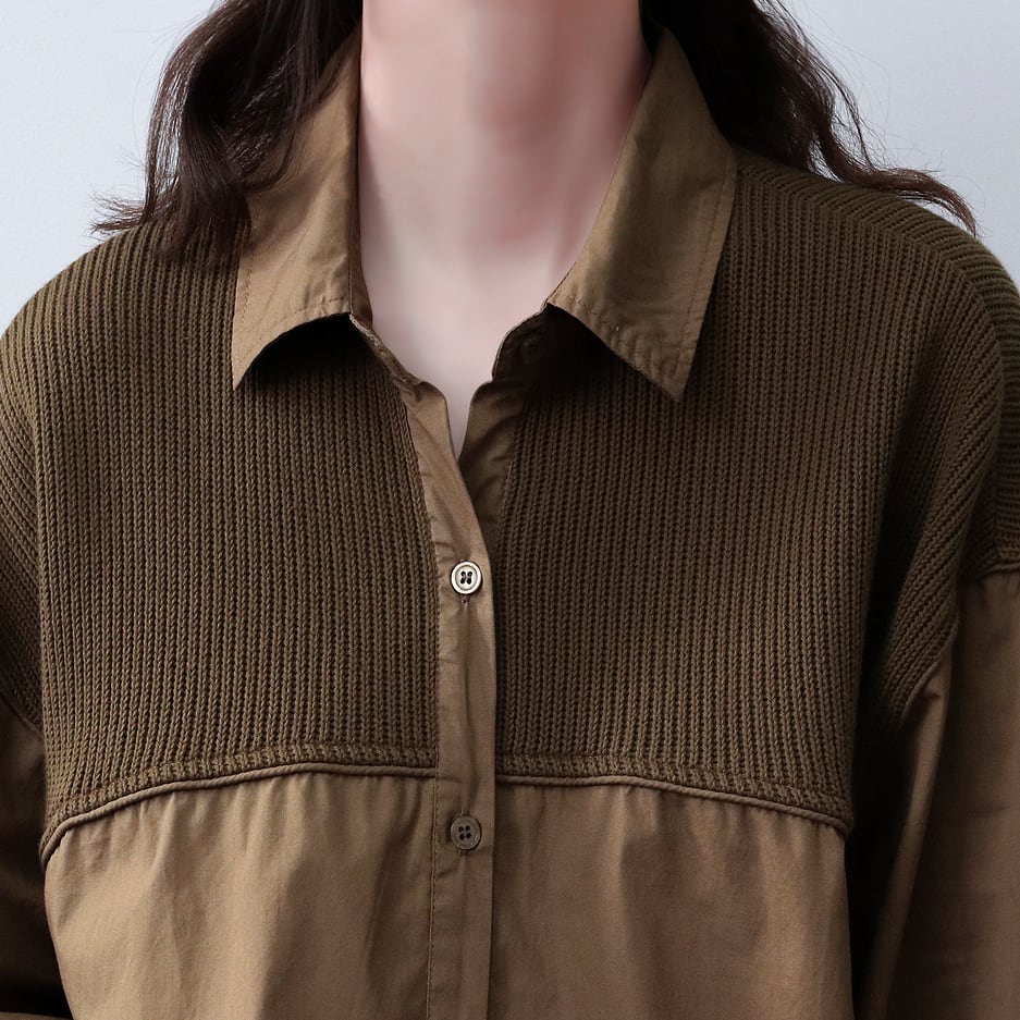 胸元に施された立体的なプリーツと、異素材を組み合わせたパッチワークデザインが特徴的なシャツ。