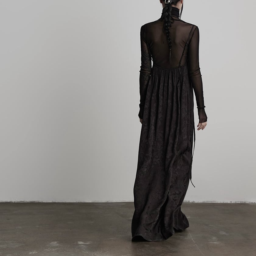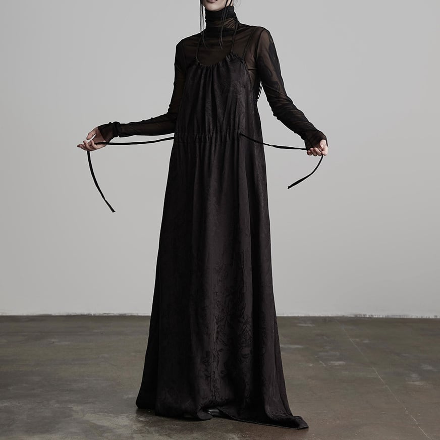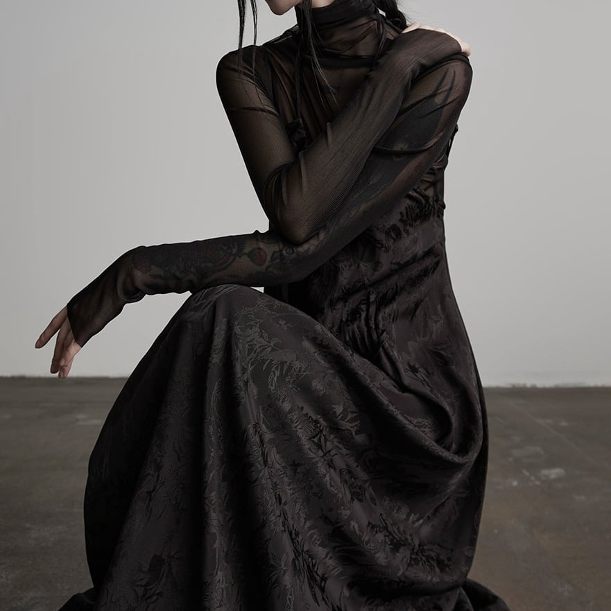 繊細な刺繍が施されたボディスと、流れるようなマキシスカート。
