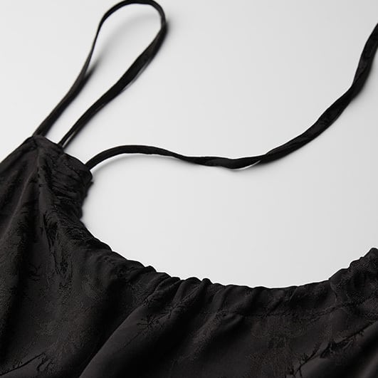 鎖骨から肩にかけてのラインを美しく強調し、女性らしさと洗練を同時に演出。