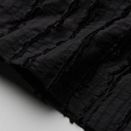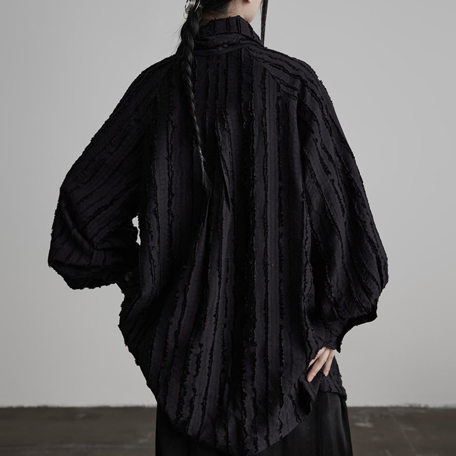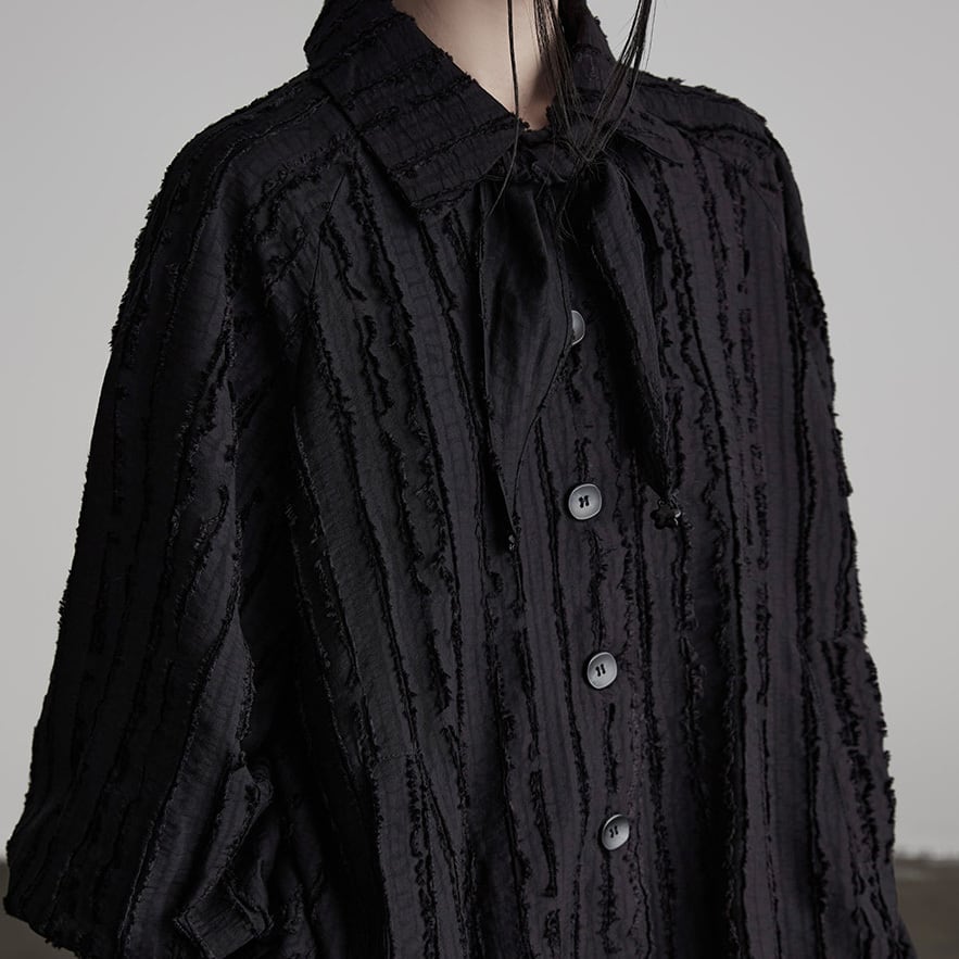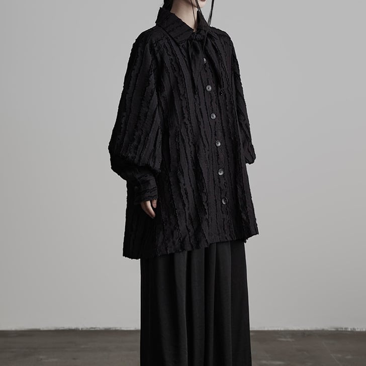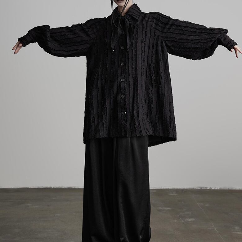 上品なテクスチャーが際立つブラックラペルのプリーツシャツ。