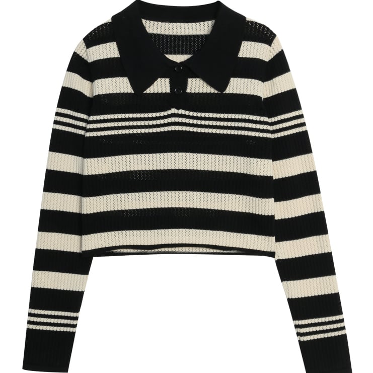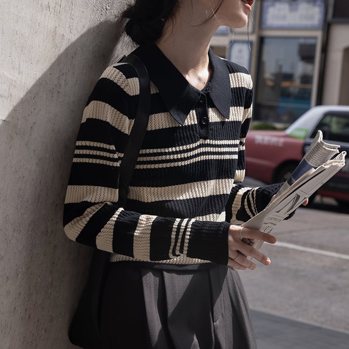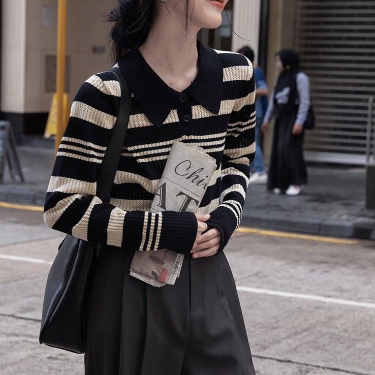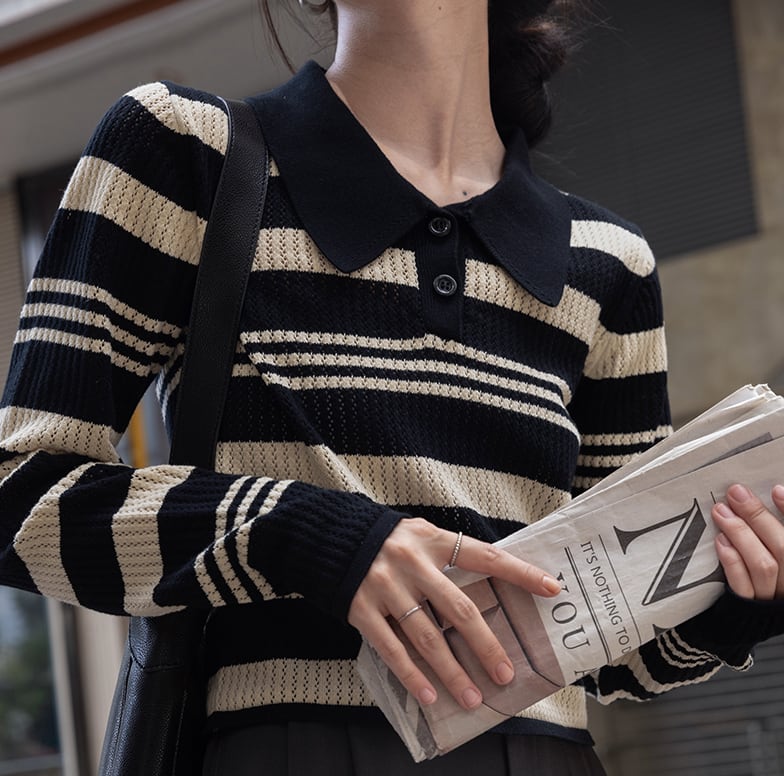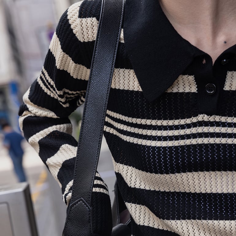 襟元のボタンデザインがきちんと感を演出しながら、ニット素材の柔らかさが程よくカジュアルダウン。