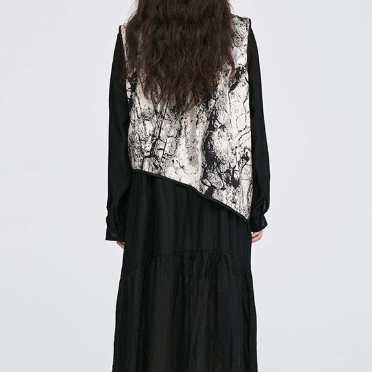 アシンメトリーな裾ラインが動きに合わせて揺れ、着る人を立体的に見せる計算されたシルエットです。