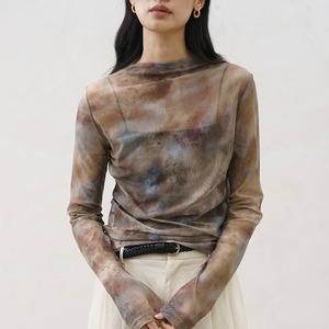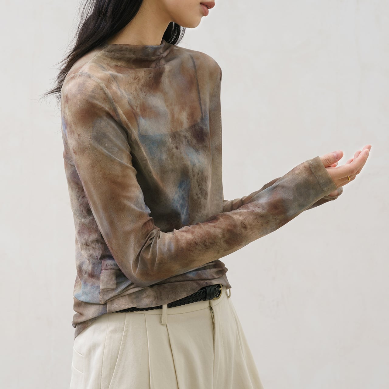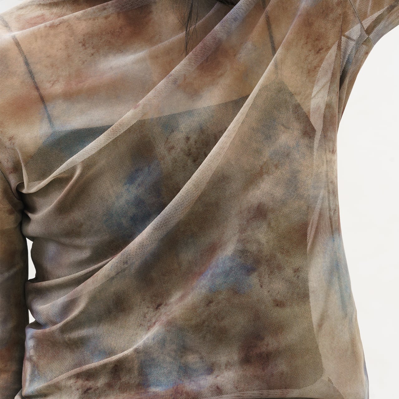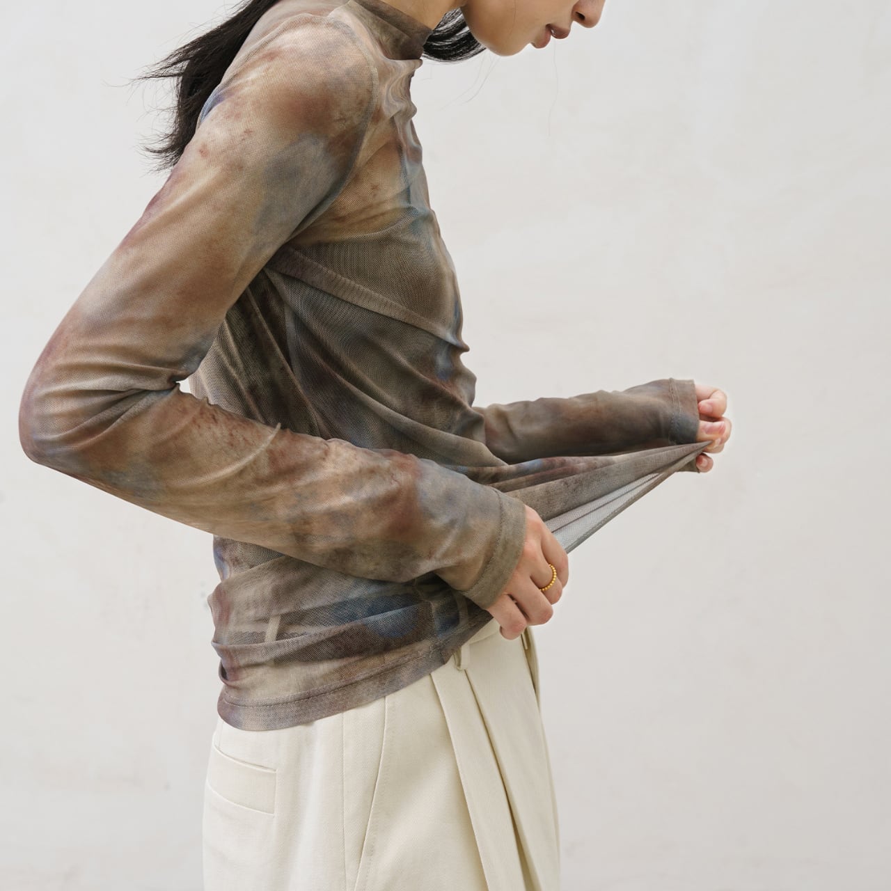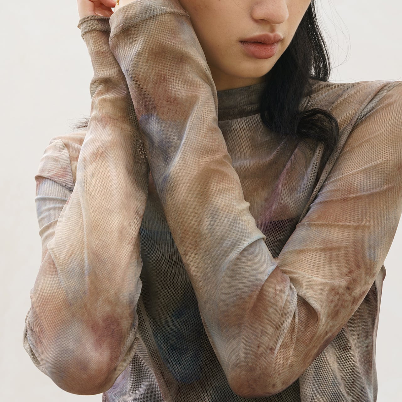 繊細なシースルー素材に描かれたベージュとブラウンの絶妙なグラデーションが、着る人をアートのような存在に。