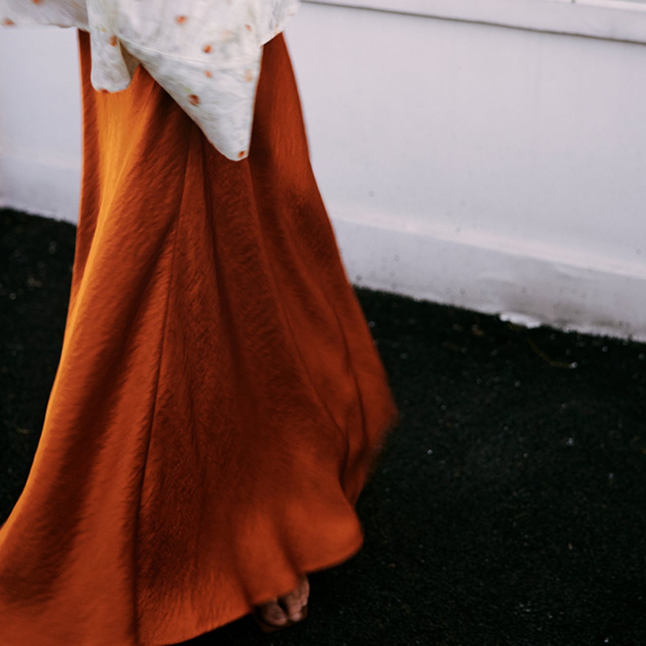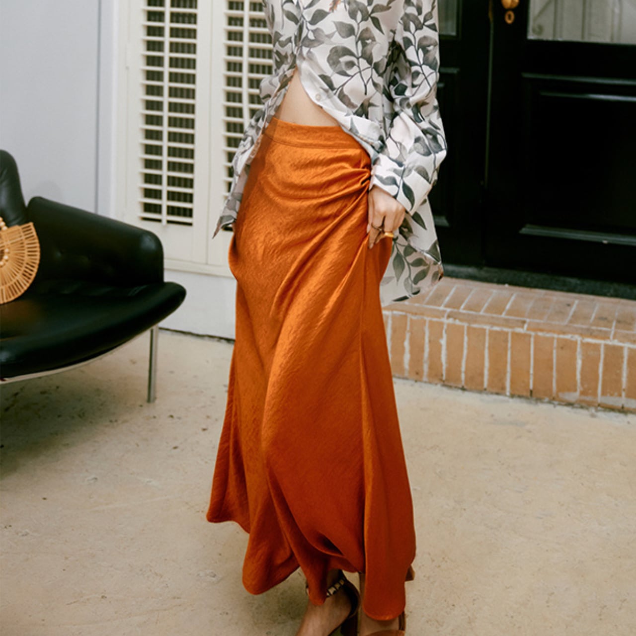 夕暮れの空を思わせる鮮やかなサンセットオレンジが目を引くスカート。