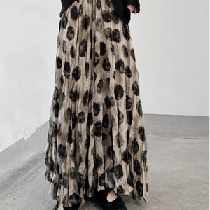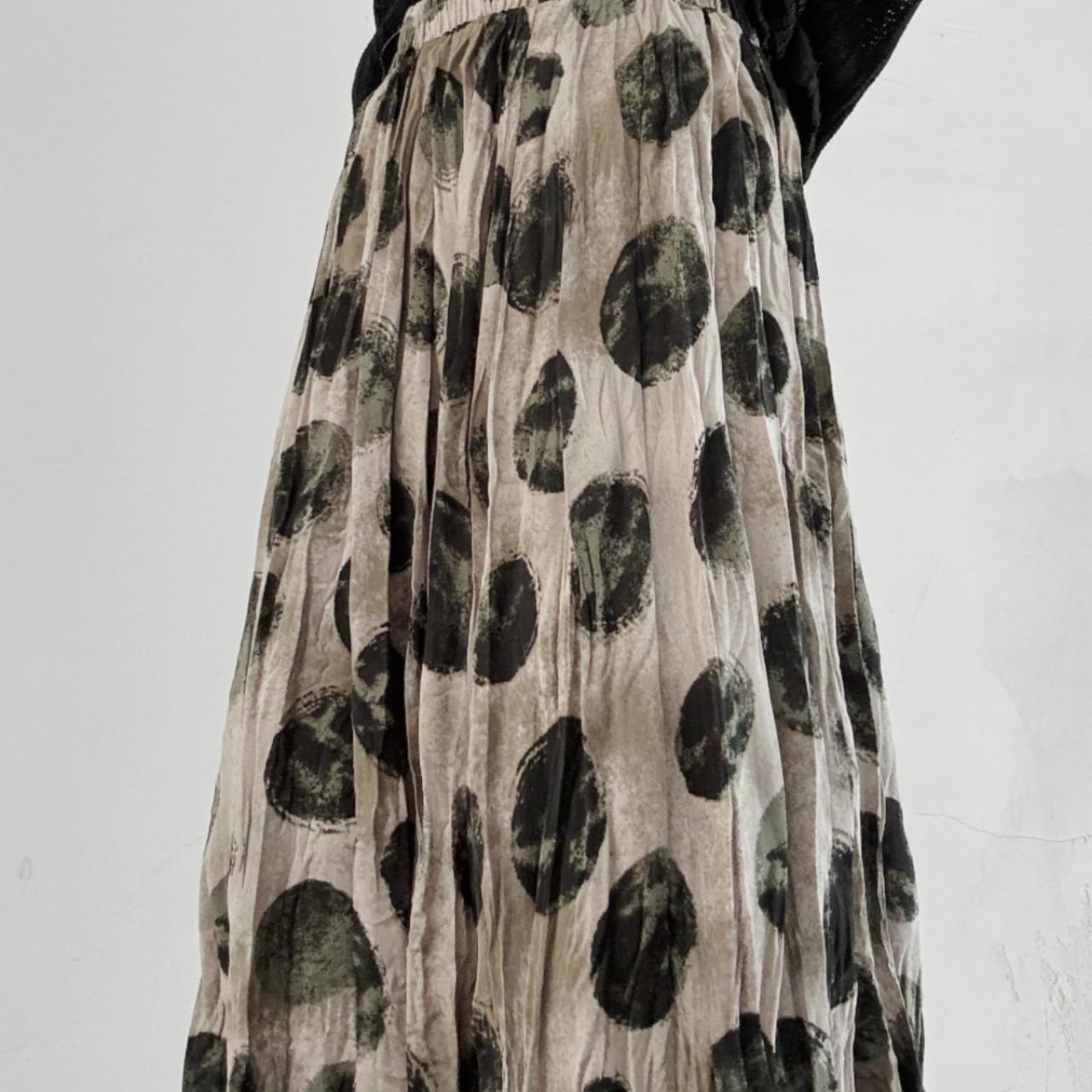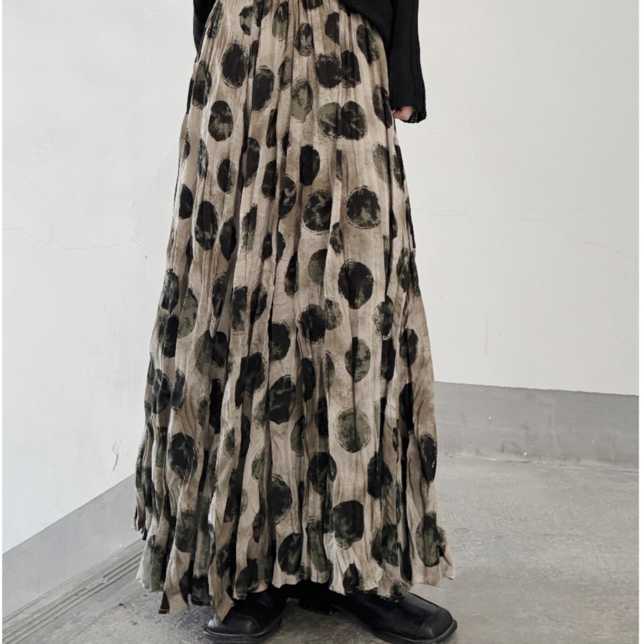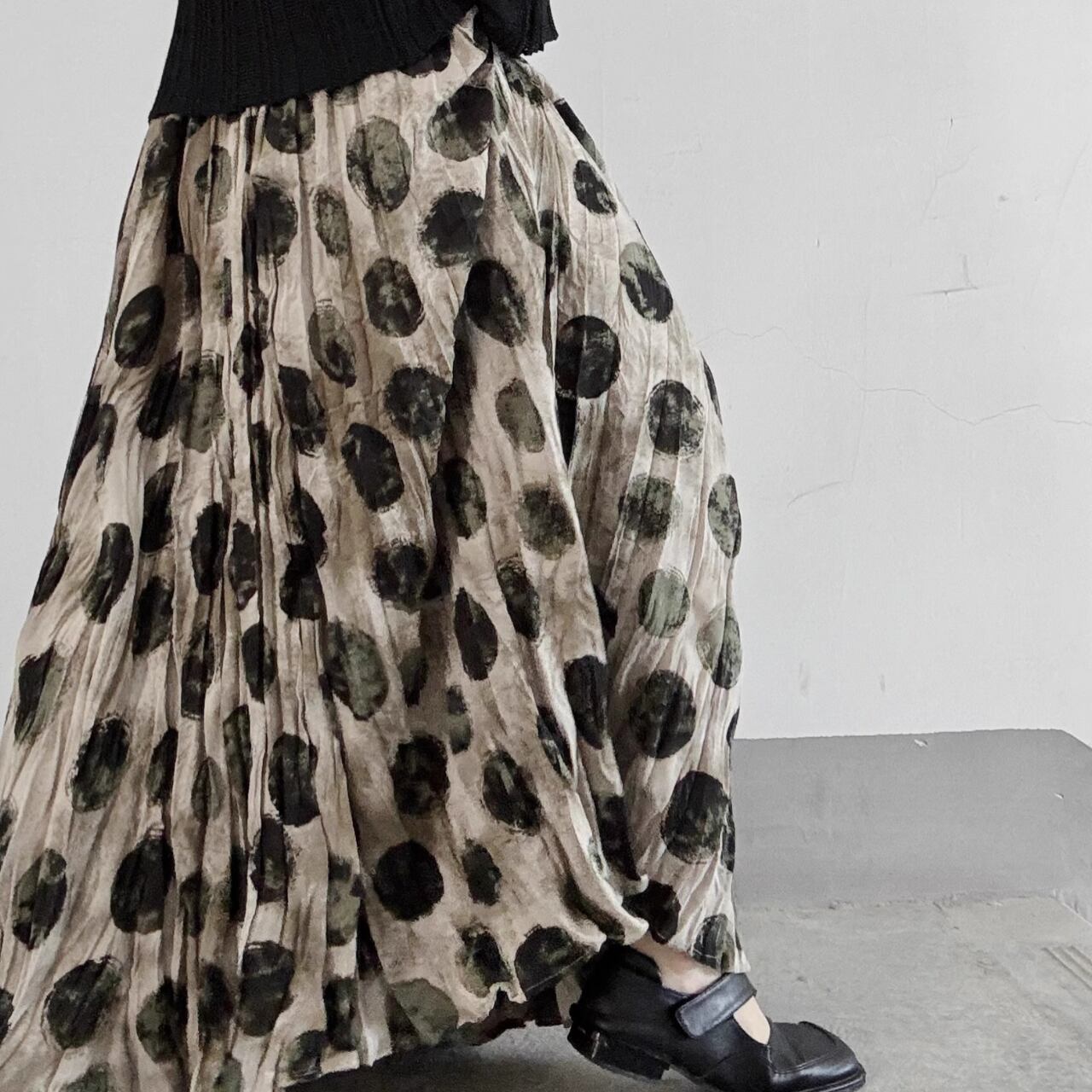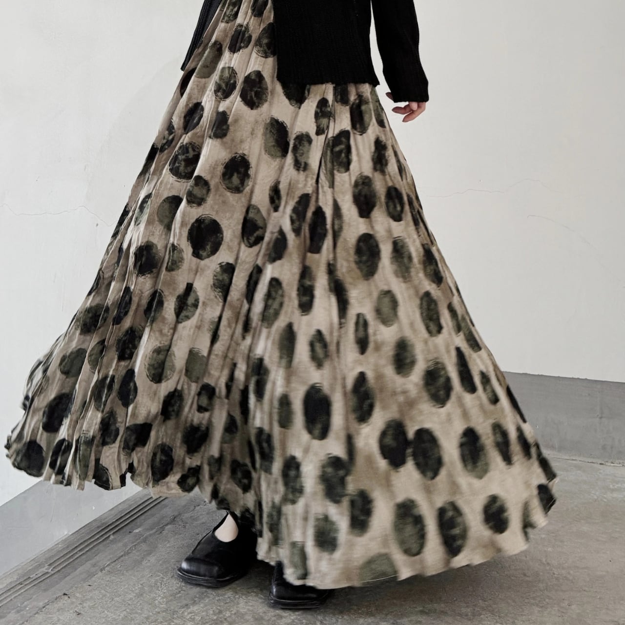 ブラウン×ブラックのコントラストが美しい、大人可愛いドット柄プリーツスカート。