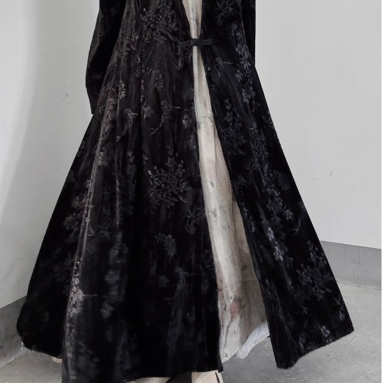 足首まで届く長さが、全身を包み込むような安心感と、歩くたびに揺れるドラマティックな動きを演出します。