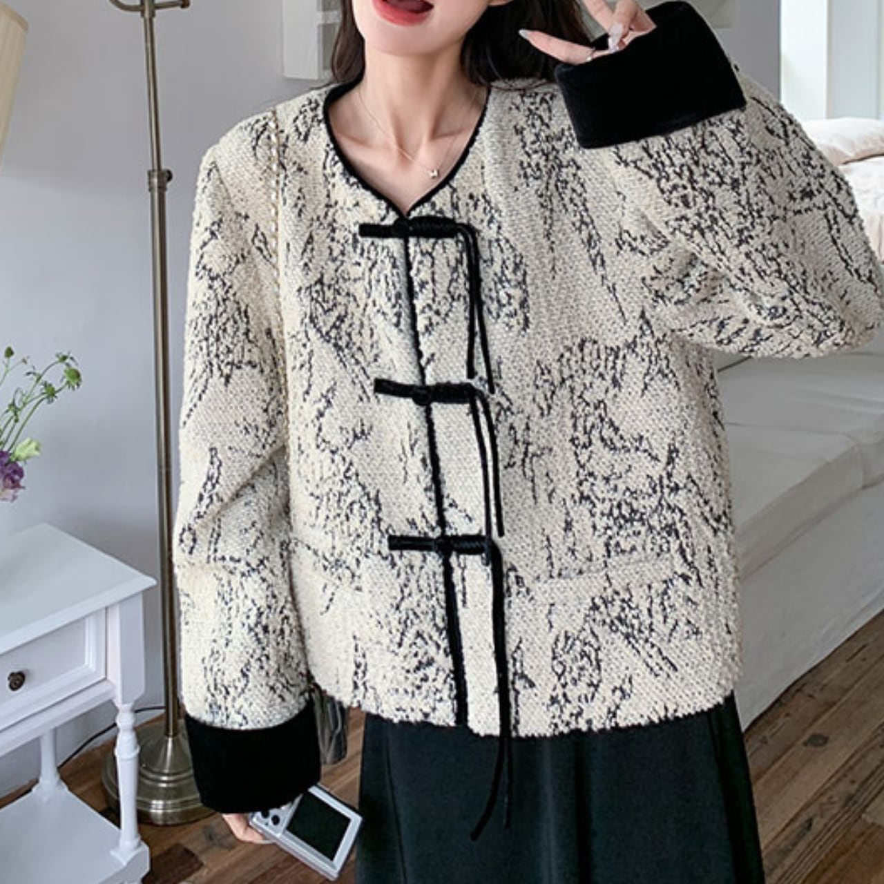 チャイナ風のボタン前立てが際立つショートジャケット。