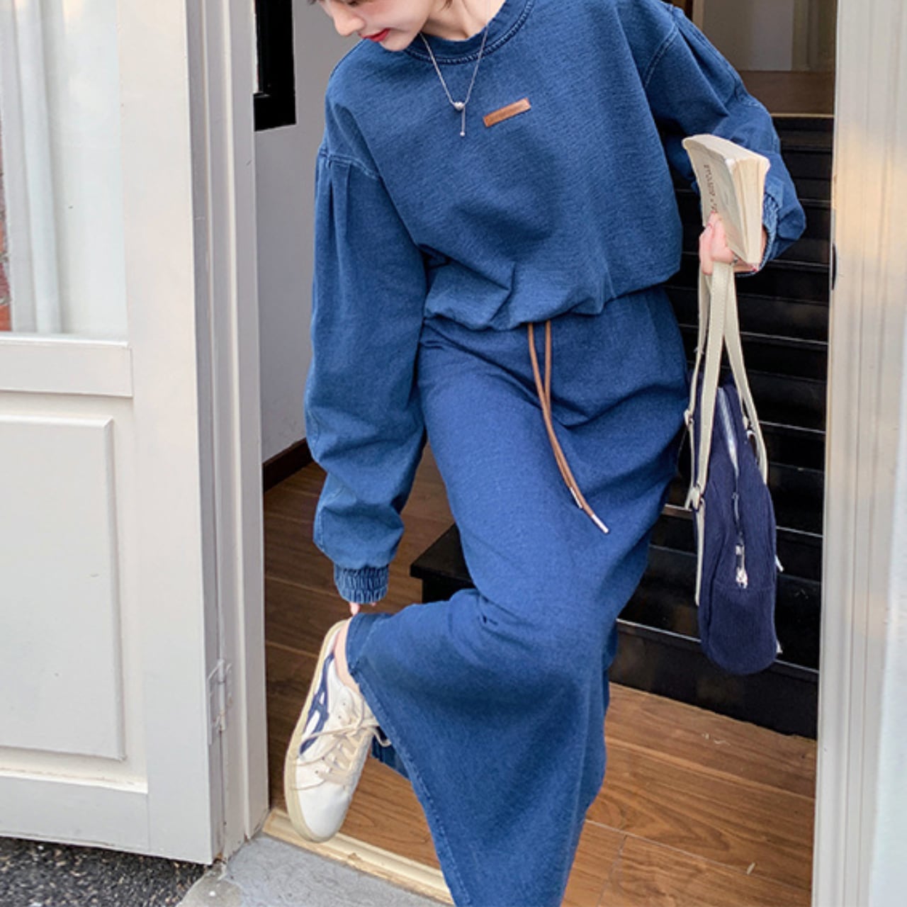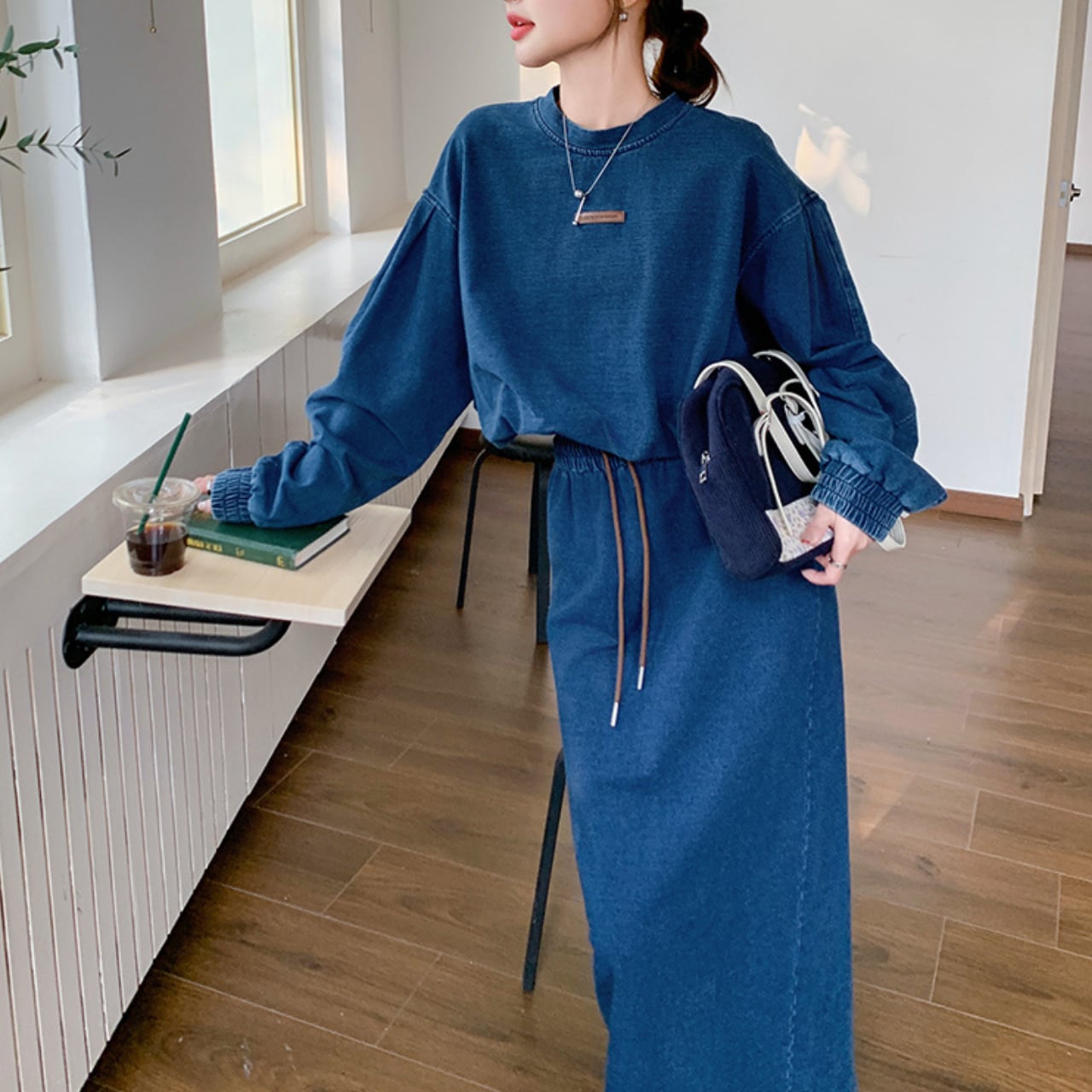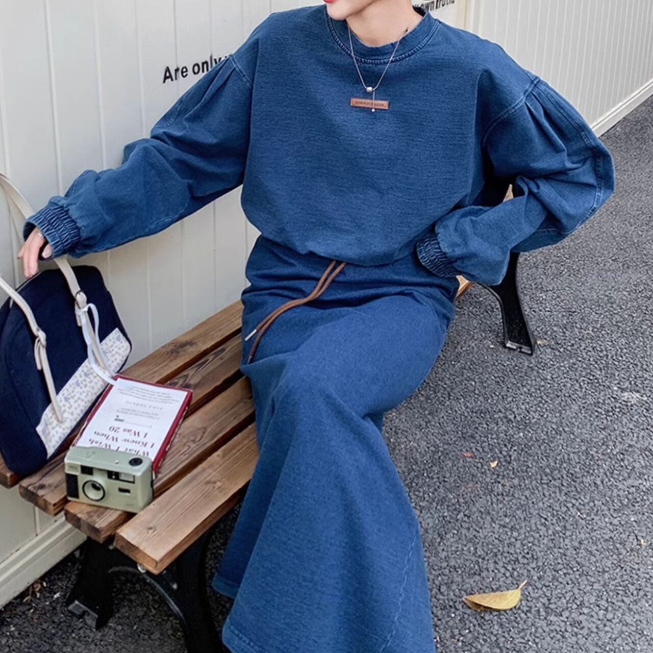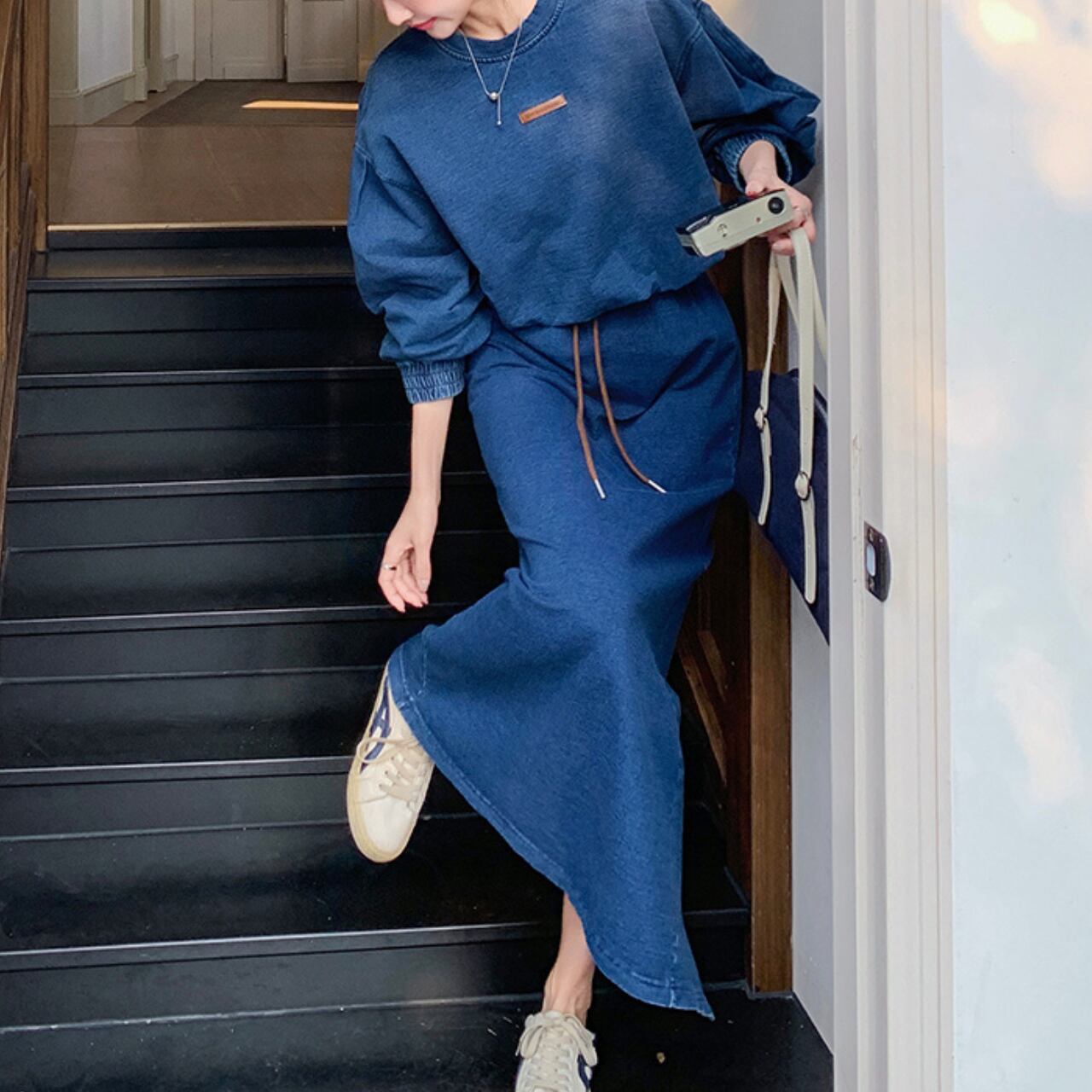 ブルーのスウェットシャツとスカートのセットアップ商品。