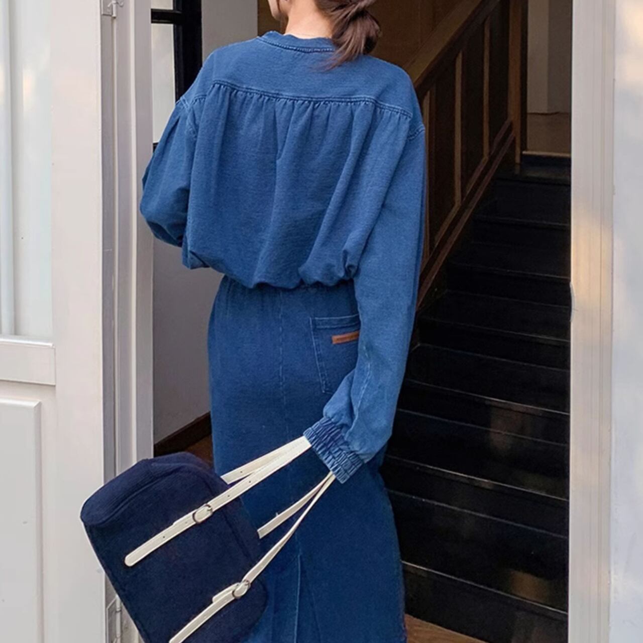美しいミディアムブルーが上品な印象を与え、カジュアルでありながらもきちんと感のあるスタイリングを可能にします。