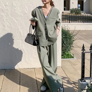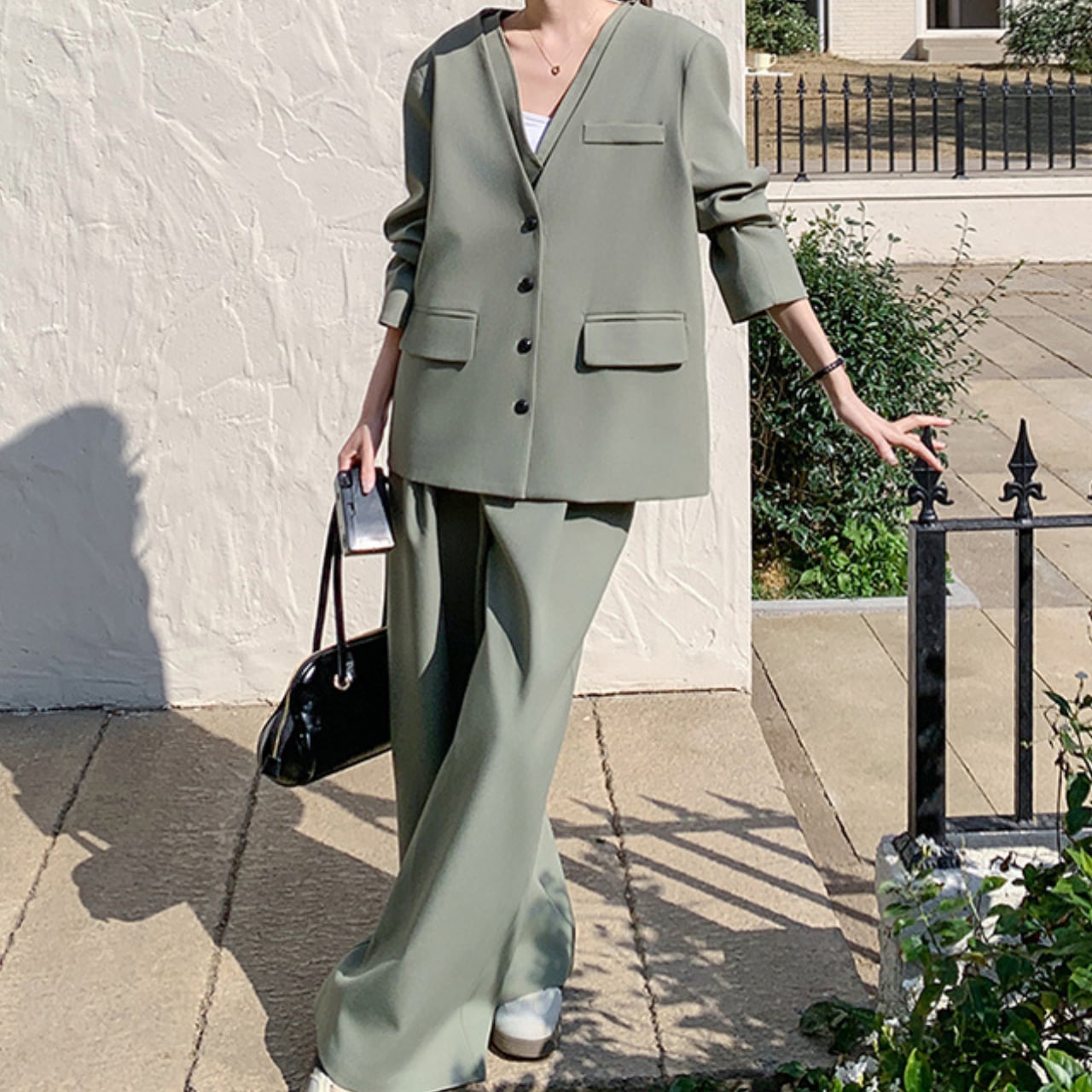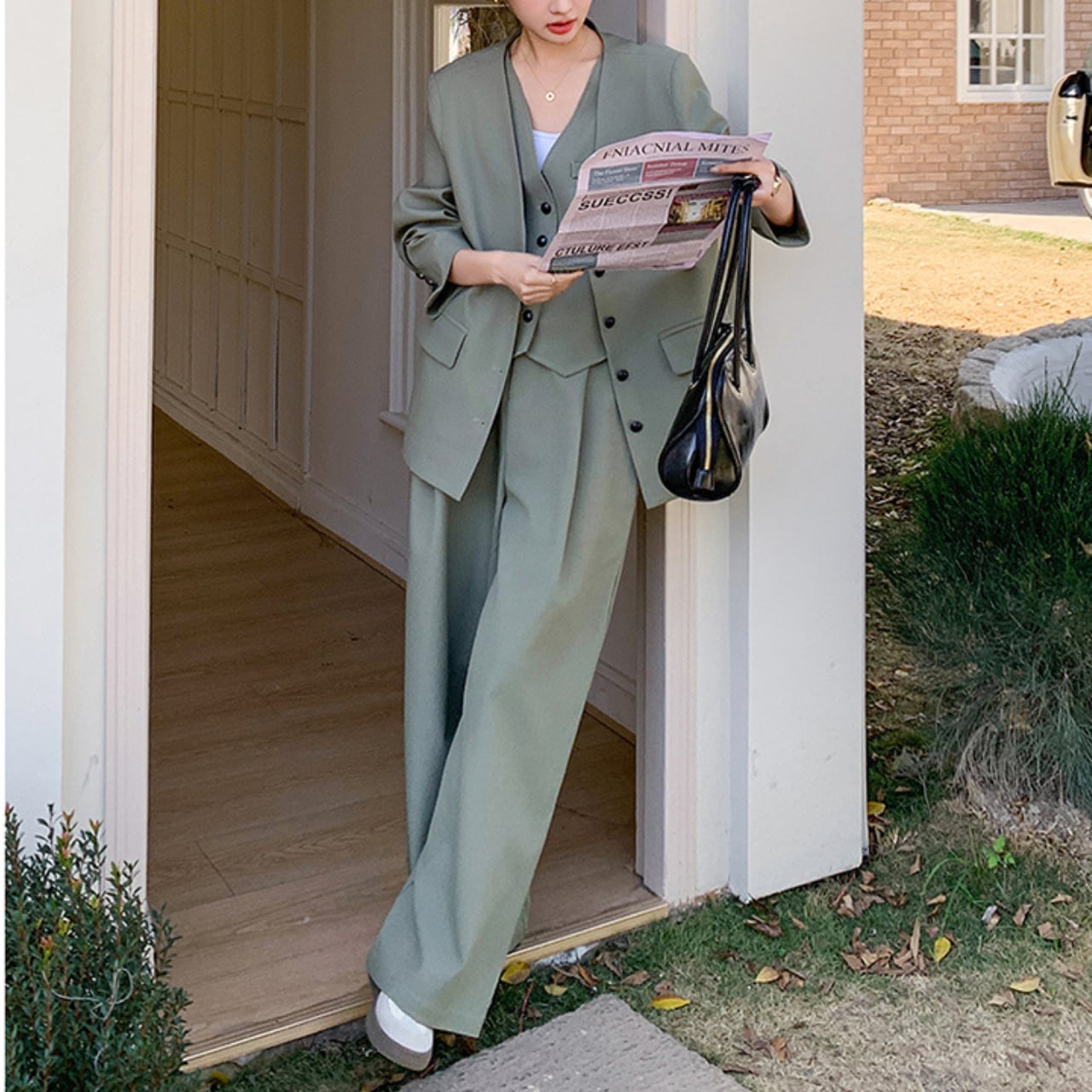 ジャケット・ベスト・パンツの3ピースが織りなす、オーバーサイズのリラックス感と洗練されたテーラード感の融合。完璧なハーモニーです。
