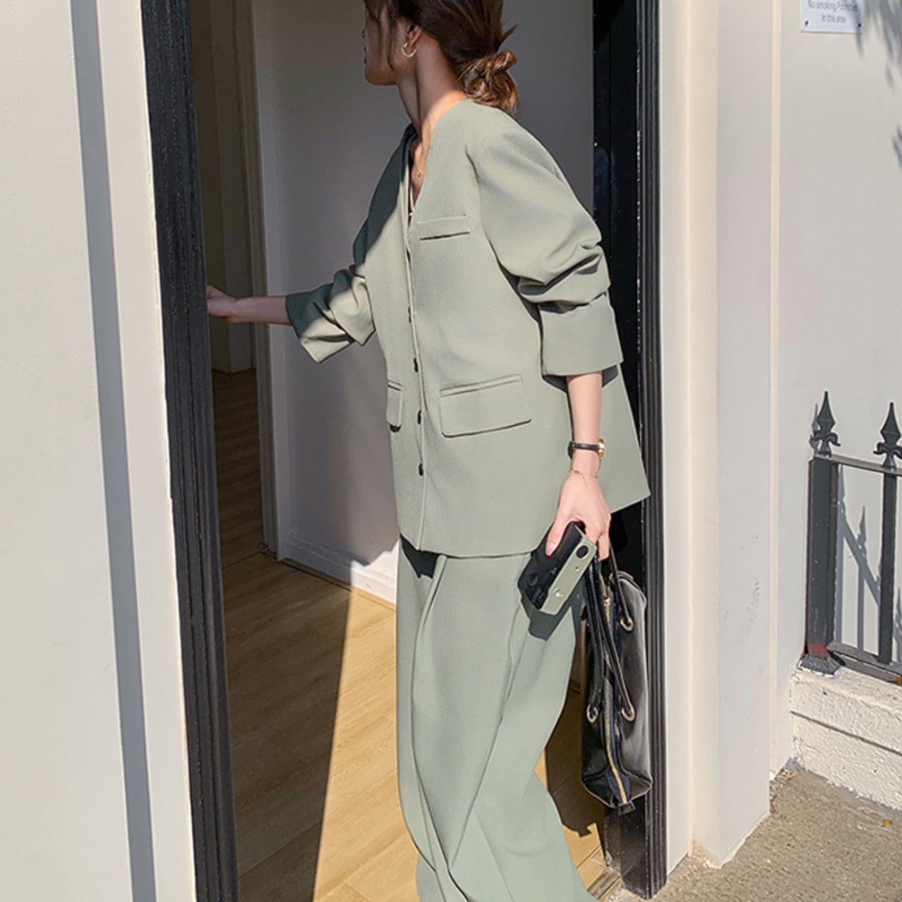 統一感のある美しいミントグリーンで仕上げた、大人女性のためのモダンセットアップ。