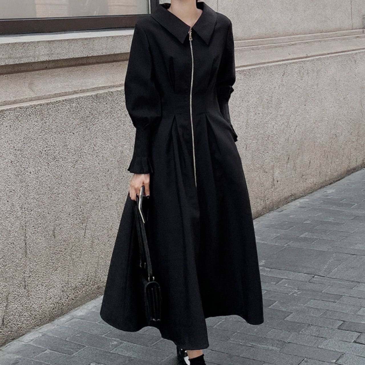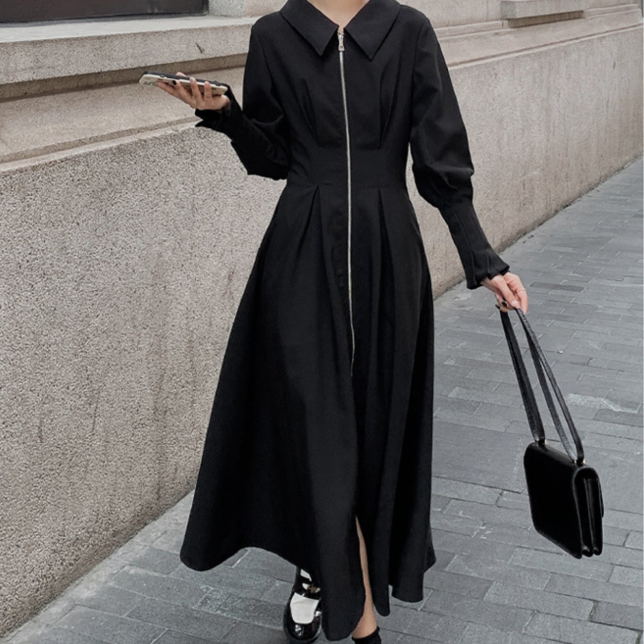 ジップアップデザインとフレアスカートがマッチしたロングワンピース。